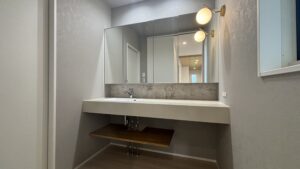 細かな部分にはなってきますが、3面鏡は既製品となっており、横幅が決まっておりますので、余ってしまうスペースにはオーダーのミラーを施工し、綺麗に納めております。