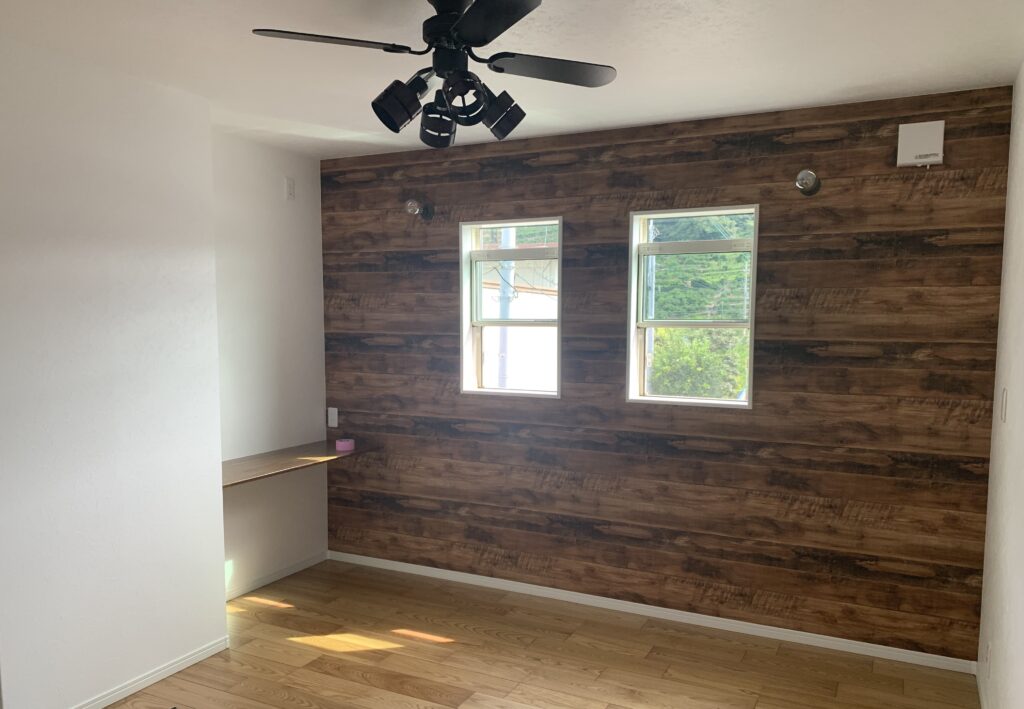 こちらはキッチン前の壁を木目調のクロスを施工しました!