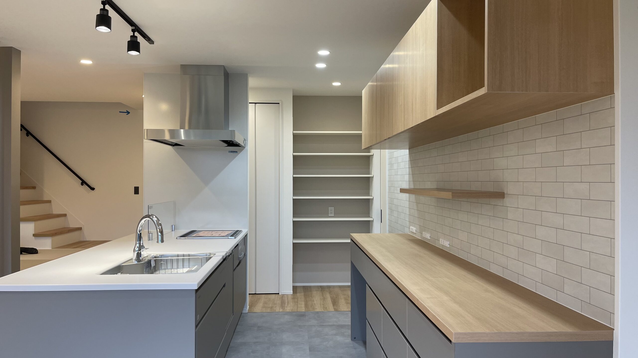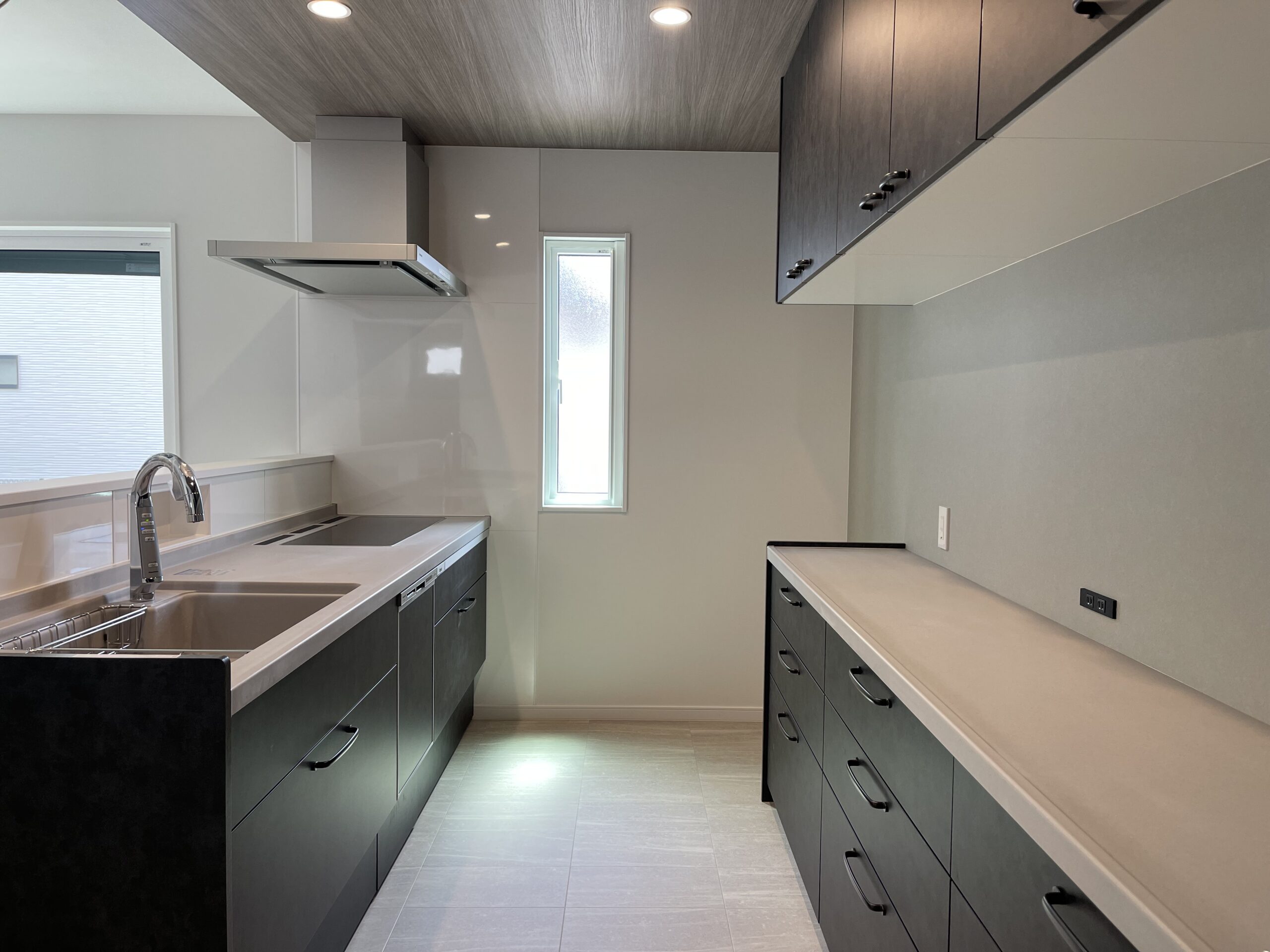 キッチンと造作カップボードの天板はコンクリート調に統一、