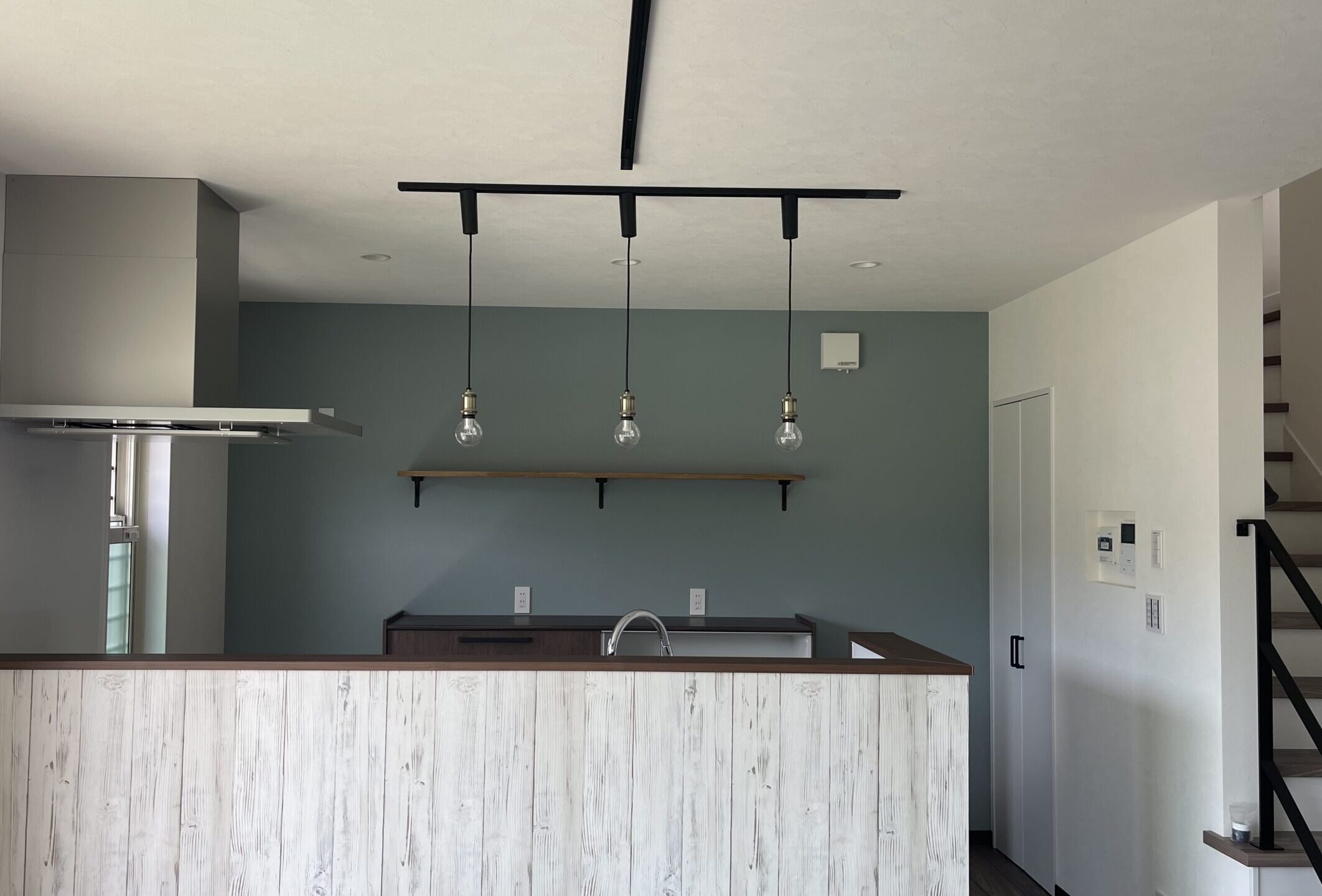 またカップボード上には、造作で集成材の棚を取り付けることで