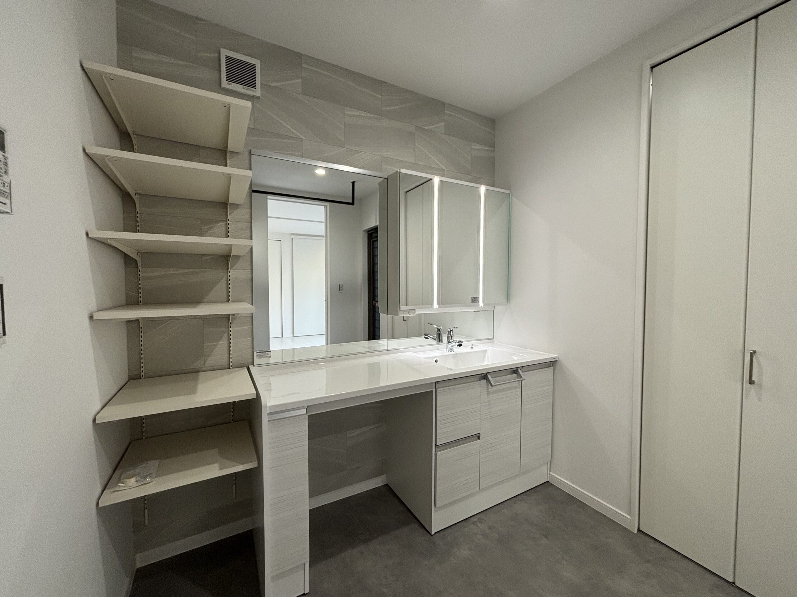 のクロスを大理石調のクロスを貼り、洗面化粧台の扉の色も大理石調の鏡面を採用。