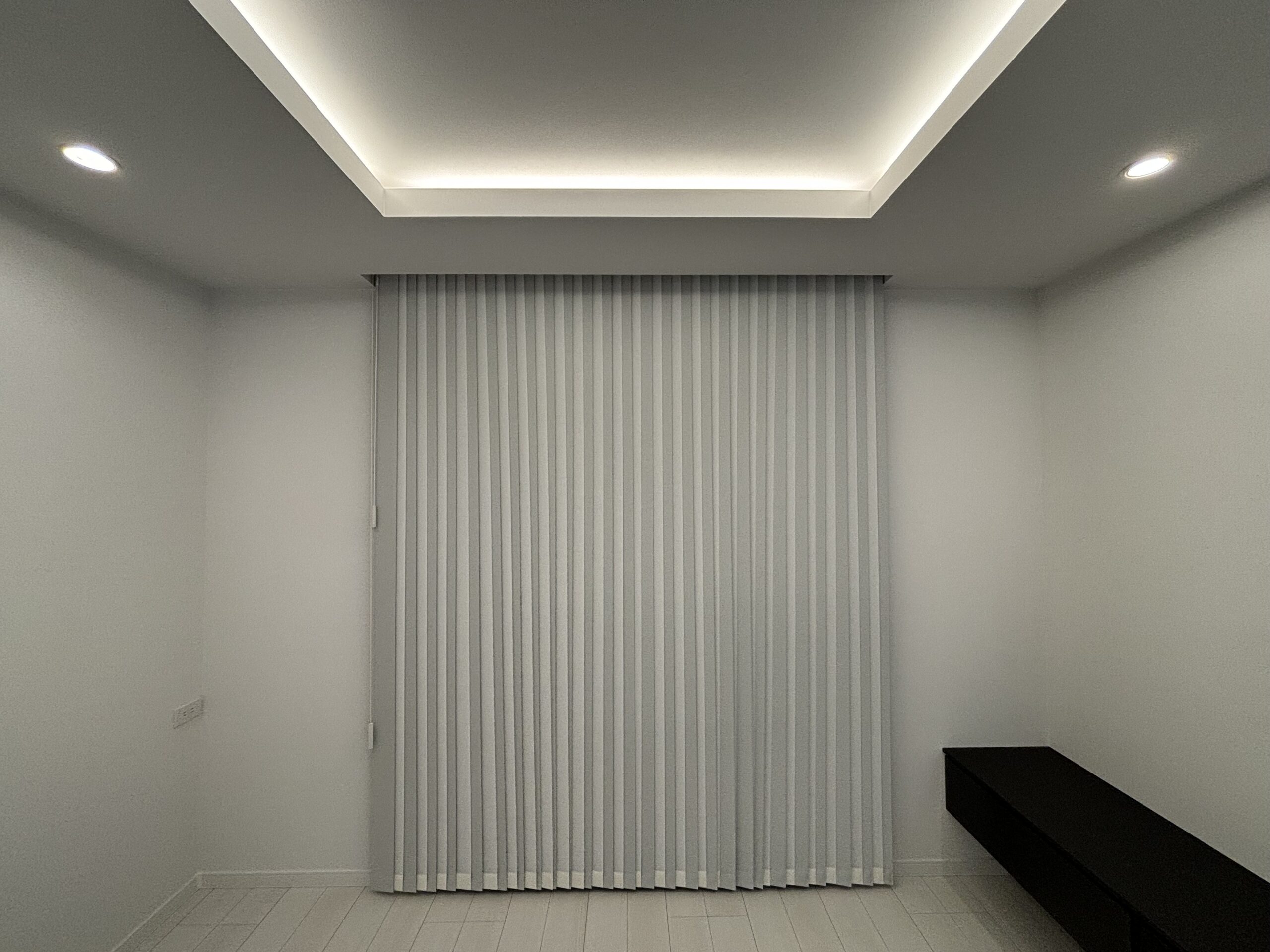 リビングも白で統一、天井の間接照明とダウンライトで高級感を演出、アクセントとして