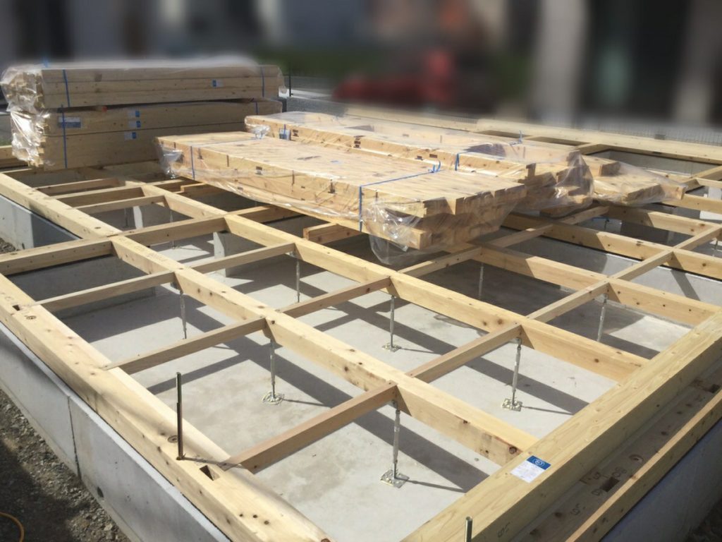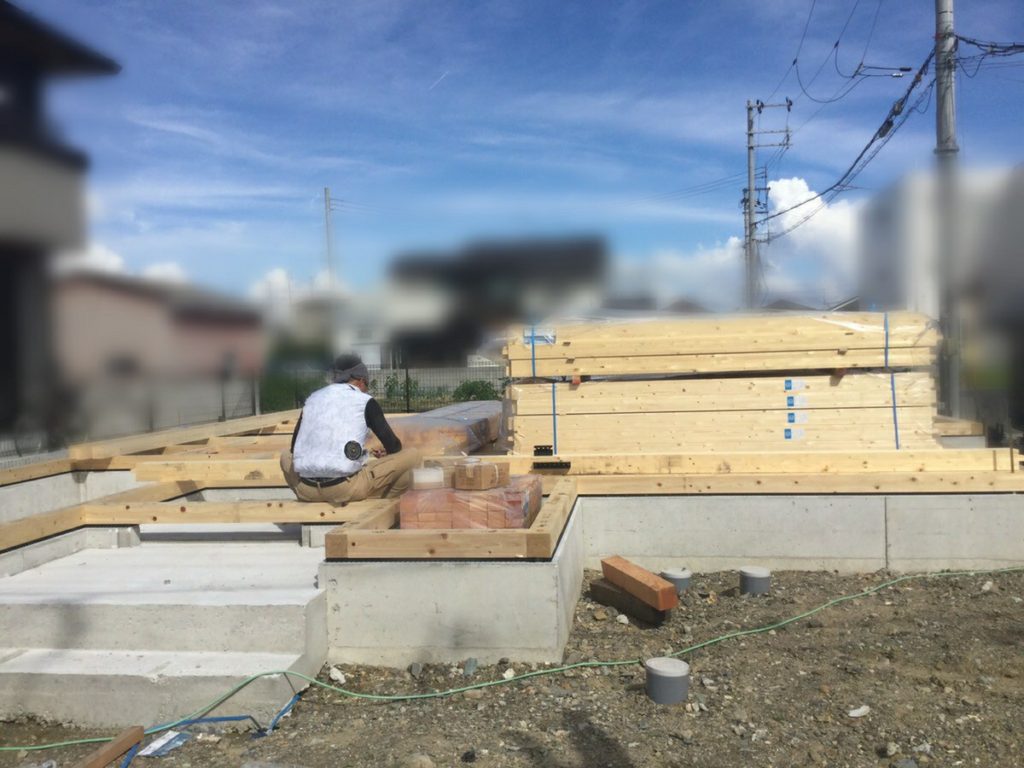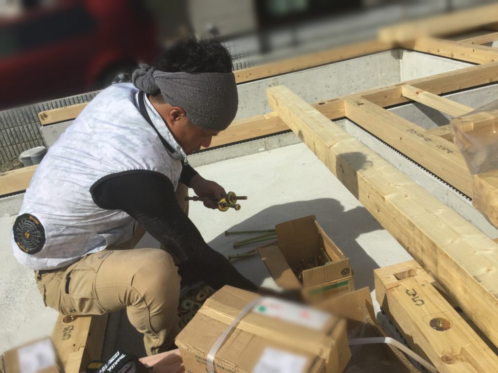 その下準備として、基礎の上に土台となる木材を敷き、柱を建てられるように準備をする必要があり、本日その作業をしていただいています。