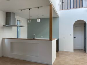 こちらはキッチンの背面に優しいミントグリーンをご採用いただきました。