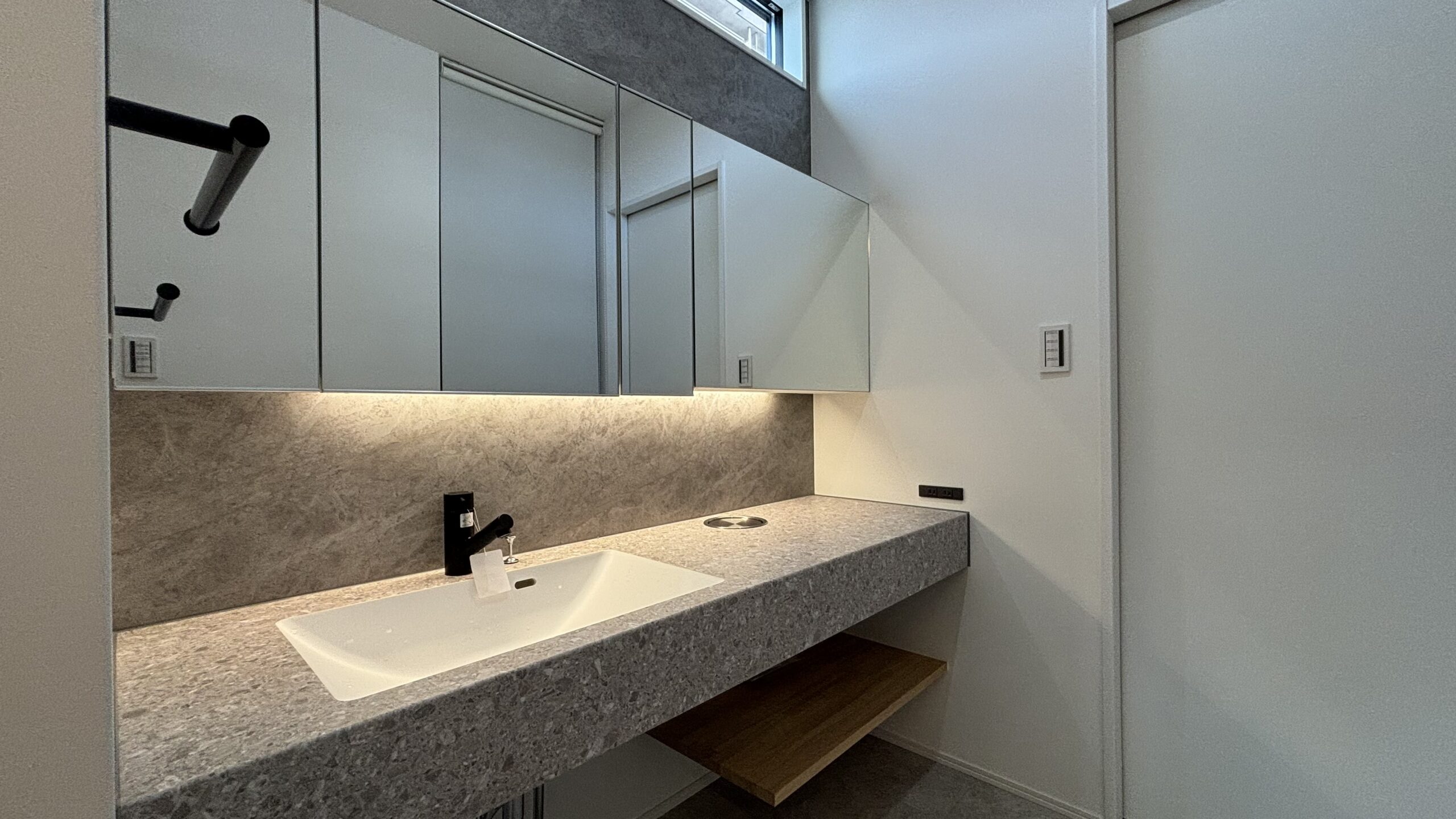 こちらは、ホテルライクなグレー系の石目柄の洗面台となっています。