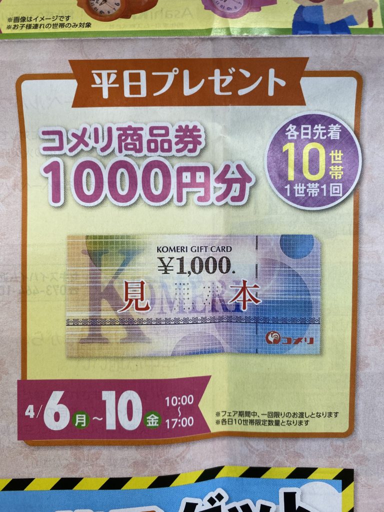 各日先着10世帯にコメリ商品券1000円分をプレゼントしてくれるみたいです!