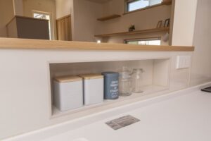 調味料が多くなるキッチンの前にニッチを作ることで、リビングからは見えない場所に収納する事が出来ます。
