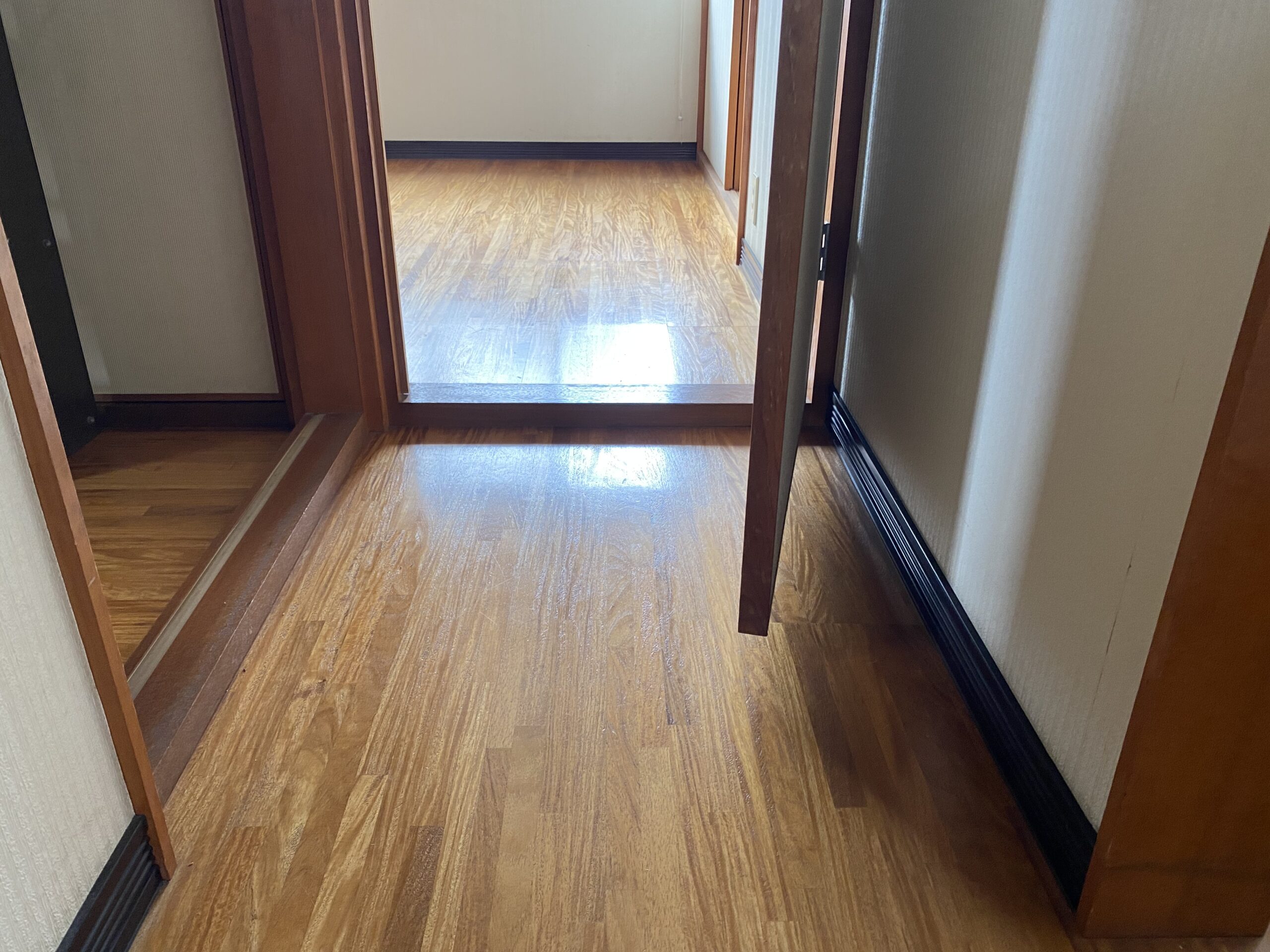 敷居と床との段差が危険な状況でしたが、キレイに取っ払いフラットに仕上げる事で移動もスムーズに安全に行き来できるように。