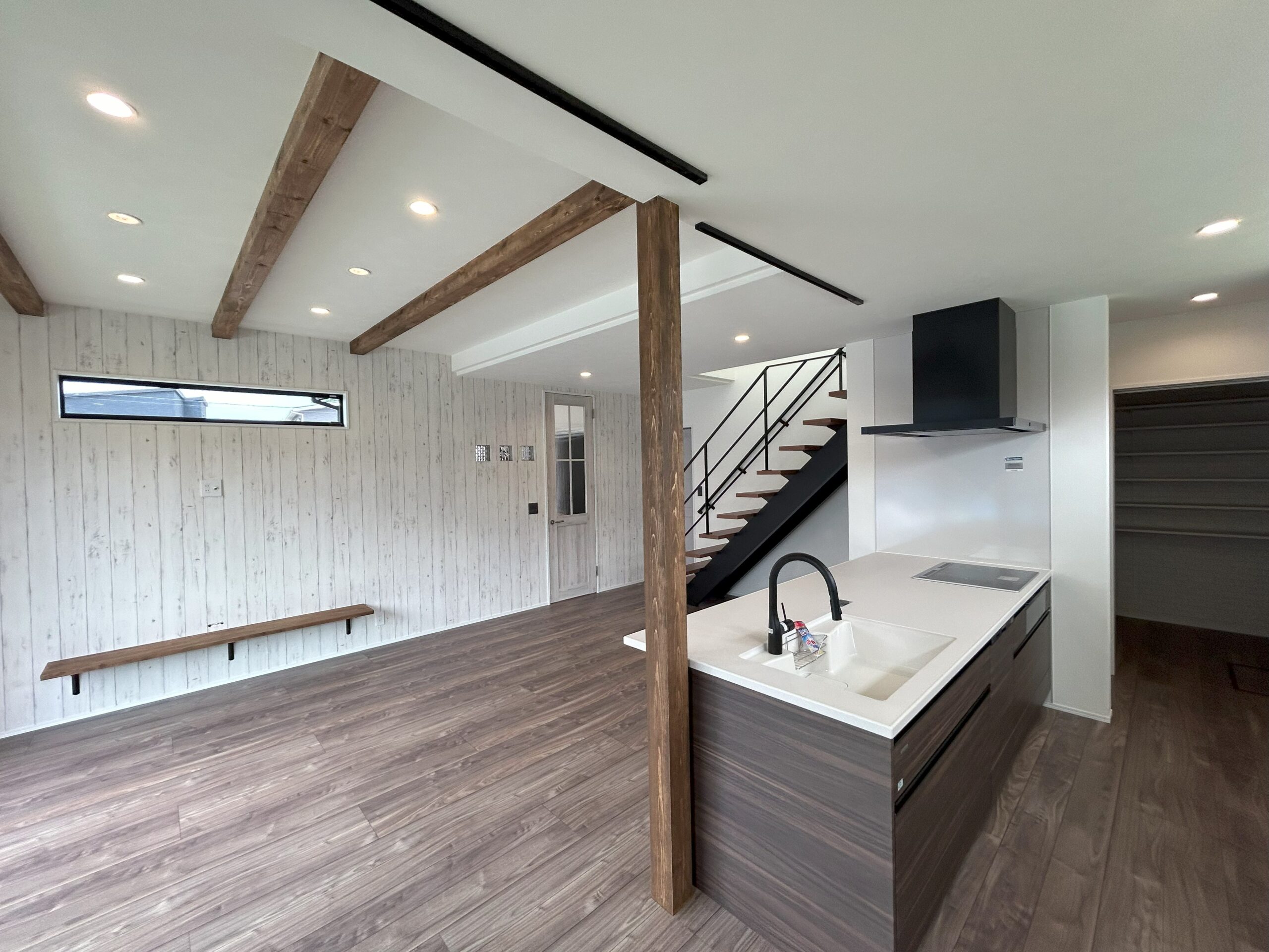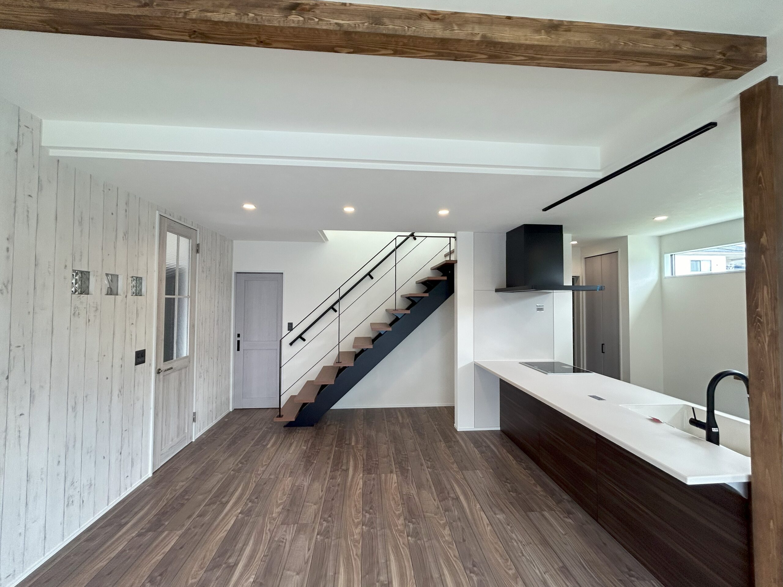 梁・柱・キッチン背面の棚板・テレビの棚板すべてを空間になじむような塗装を施し、色を合わせていきました。