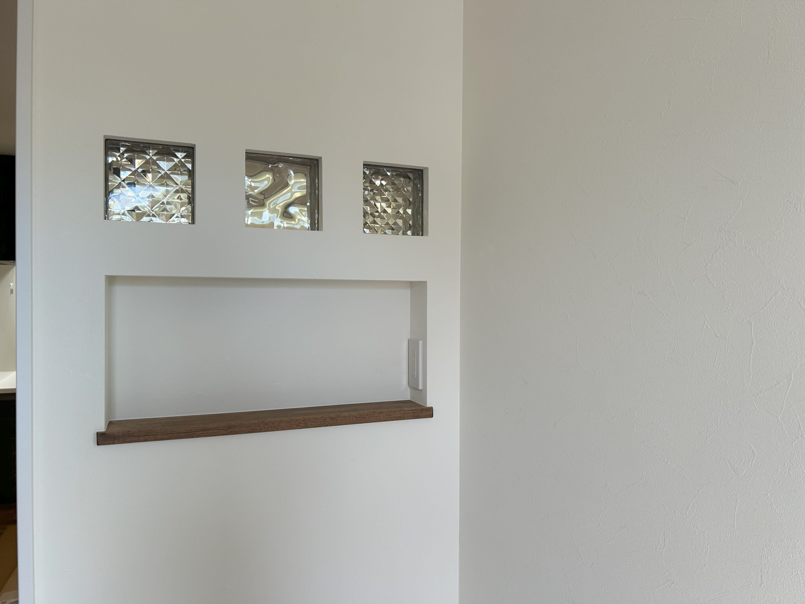 リビングのガラスブロックの裏側にはニッチを設けており、ニッチとガラスブロックで見た目を一味こだわりました。
