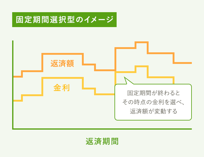 3年、5年、10年など、固定期間を選ぶとその間は金利も返済額も固定され、固定期間が終わるとその時点の金利で再び固定期間を選べるのが固定期間選択型です。
