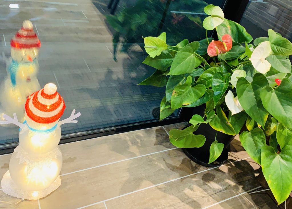 本社の冬到来ディスプレイは窓越しから可愛い雪だるまがお出迎えしております☆