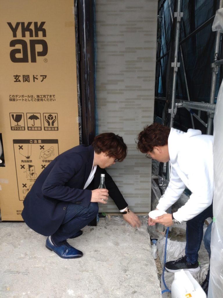 酒・塩・洗い米で四方を回り、玄関前で記念の写真をパシャリ☆