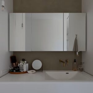 鏡は付いておりませんが、照明と洗面の間にmiratpの横幅1m20cmの三面鏡スミスを