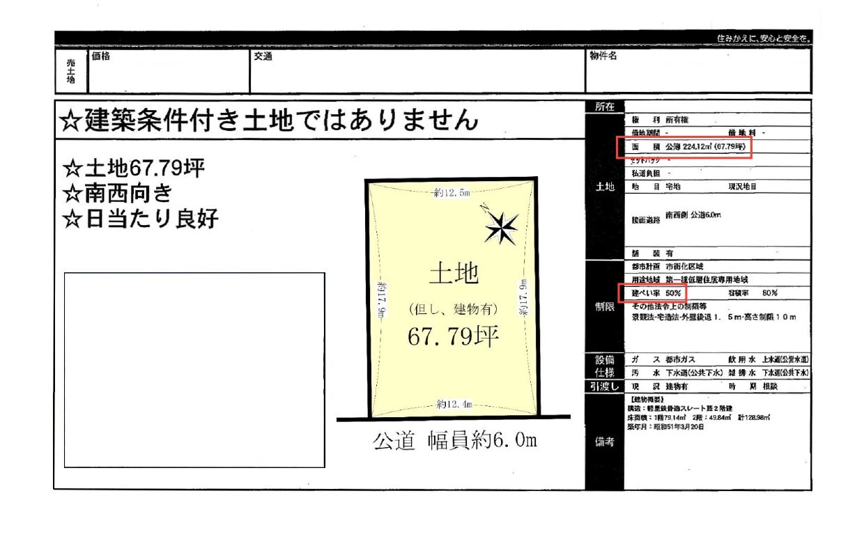 たとえば、この敷地に住宅を建てようと思ったとき224.12㎡の土地で建ぺい率が50%で制限されていますので