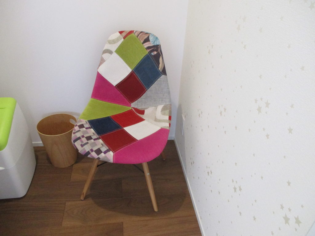 同じく2階の授乳室のパッチワークの張地の椅子、この華やかな色に女子力上がりそう?