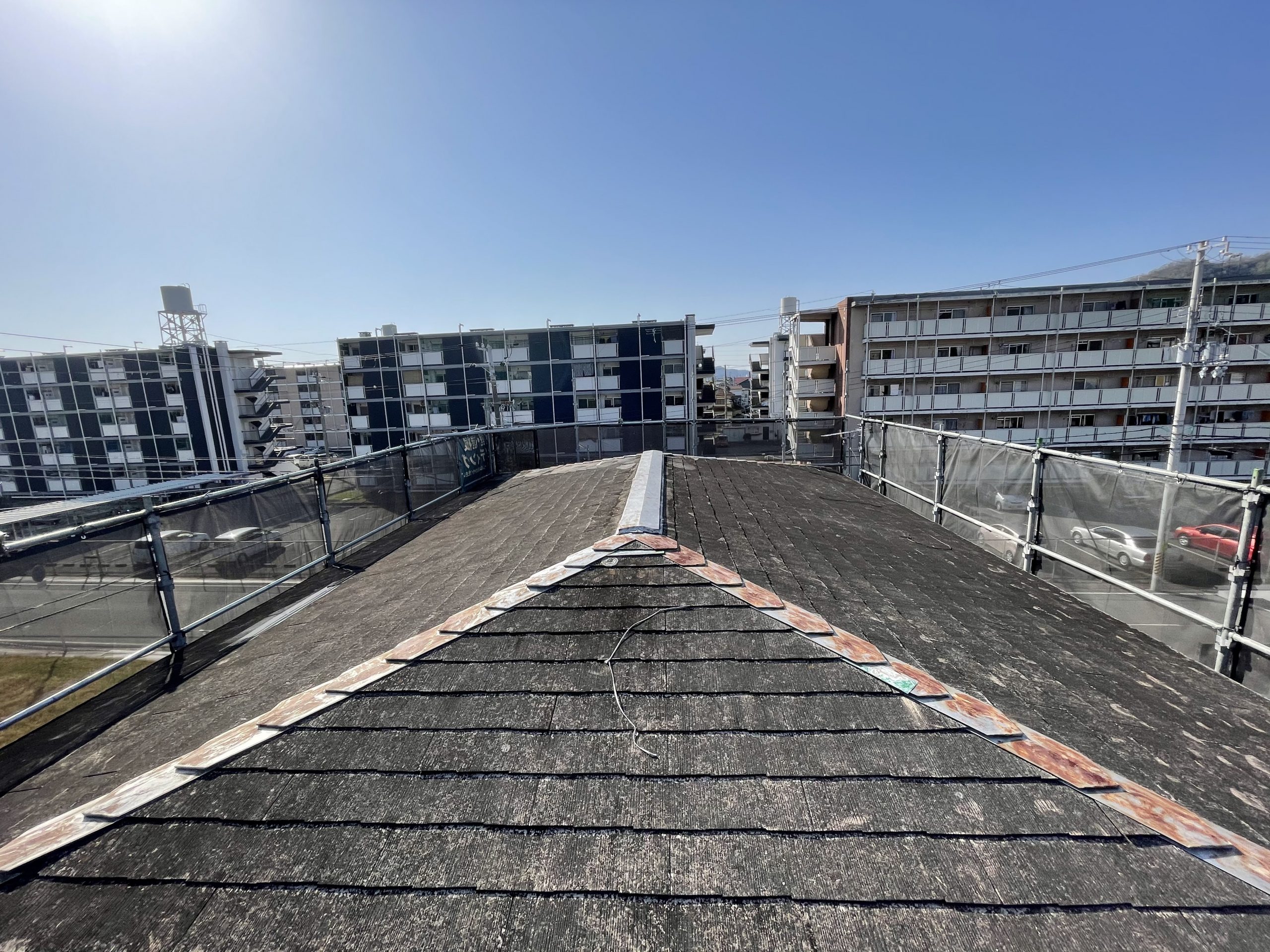 まずは、スレート瓦屋根のリフォーム工事について、写真のようにスレート瓦の場合、築10年を過ぎると立地条件にもよりますが太陽の光や雨により色が抜け防水効果もなくなり雨漏りの原因となります。