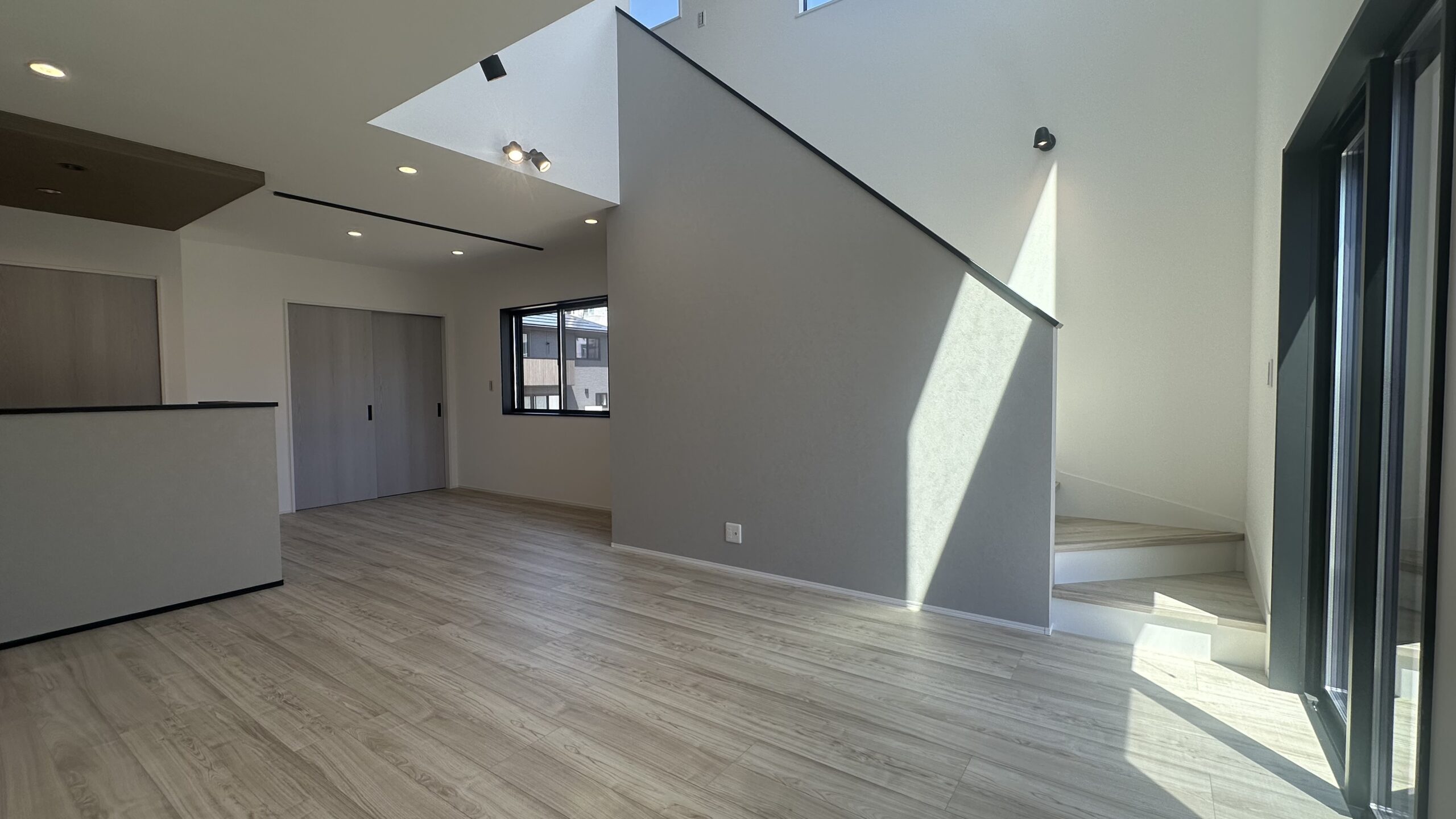 リビングは吹抜けとなっており、南面の窓から光が差し込み、日中はとても明るい空間となります。