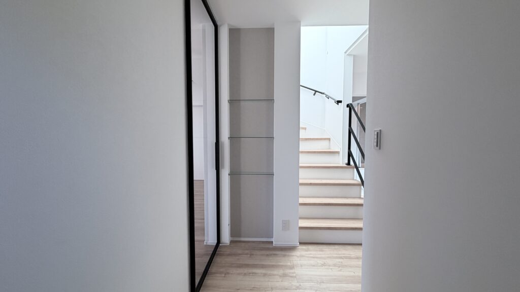 玄関入って正面にはガラス棚付きのディスプレイスペース。