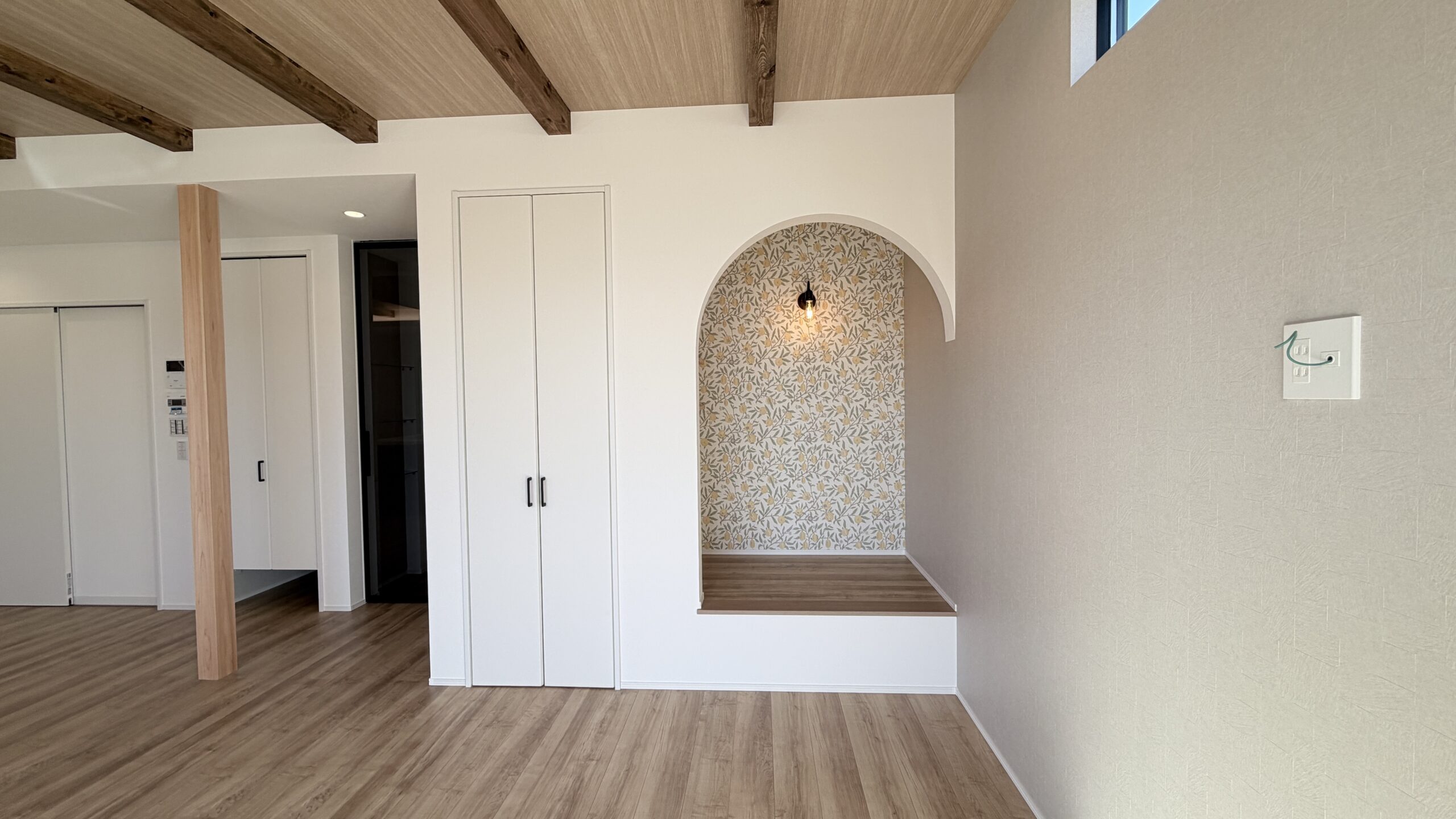 床材、収納、梁に使われた木目が温かみを演出しながら、白い壁と建具が空間を広く見せています。