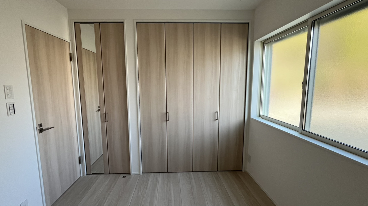 今回、姿見を置くスペースを省きたいとご要望いただきましたので、収納の折れ戸を鏡付きの