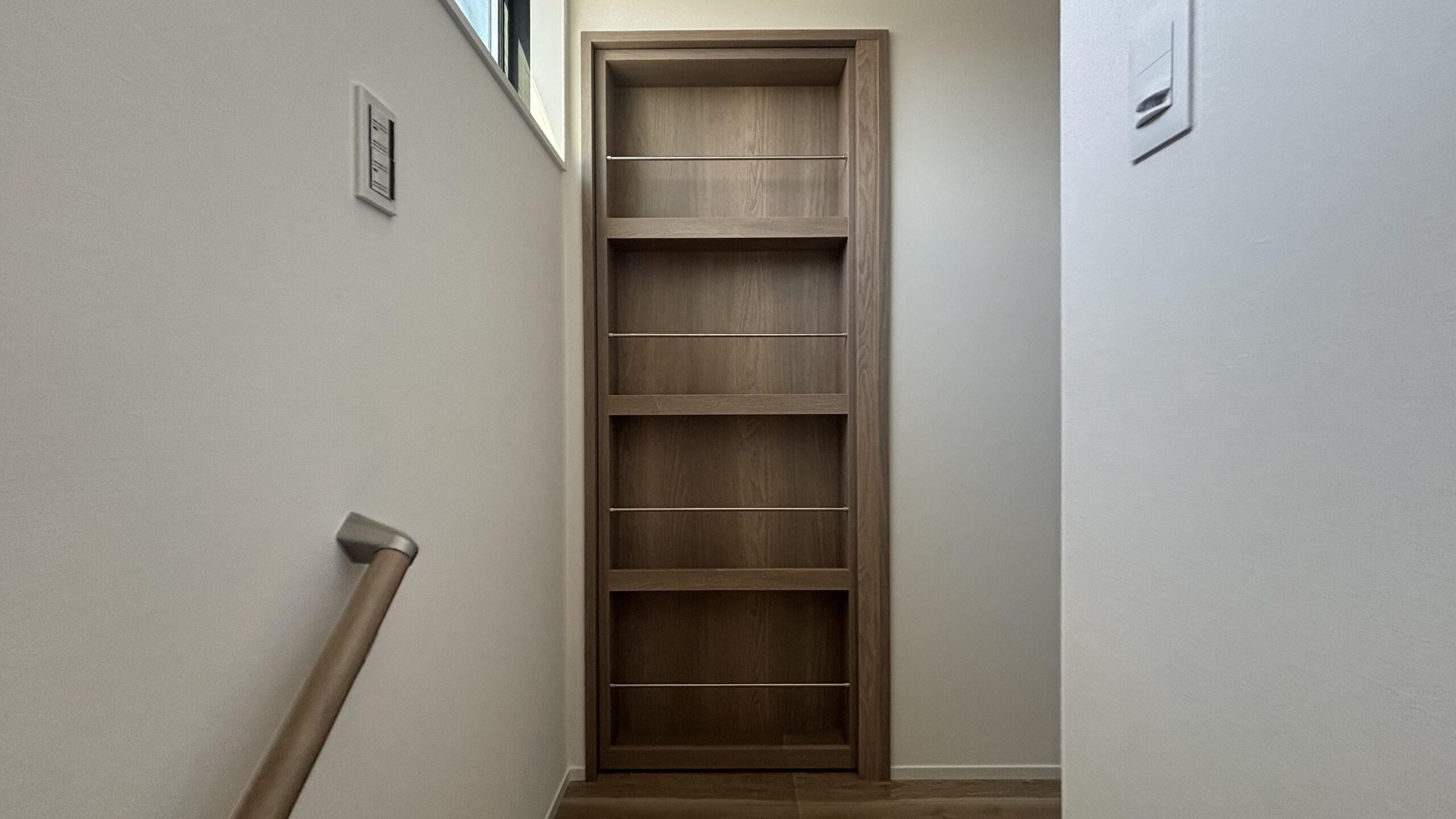 今回、書斎の位置が階段上がって正面にあり、扉感を無くしたいと言ったご要望により、隠し扉を採用いただいております。