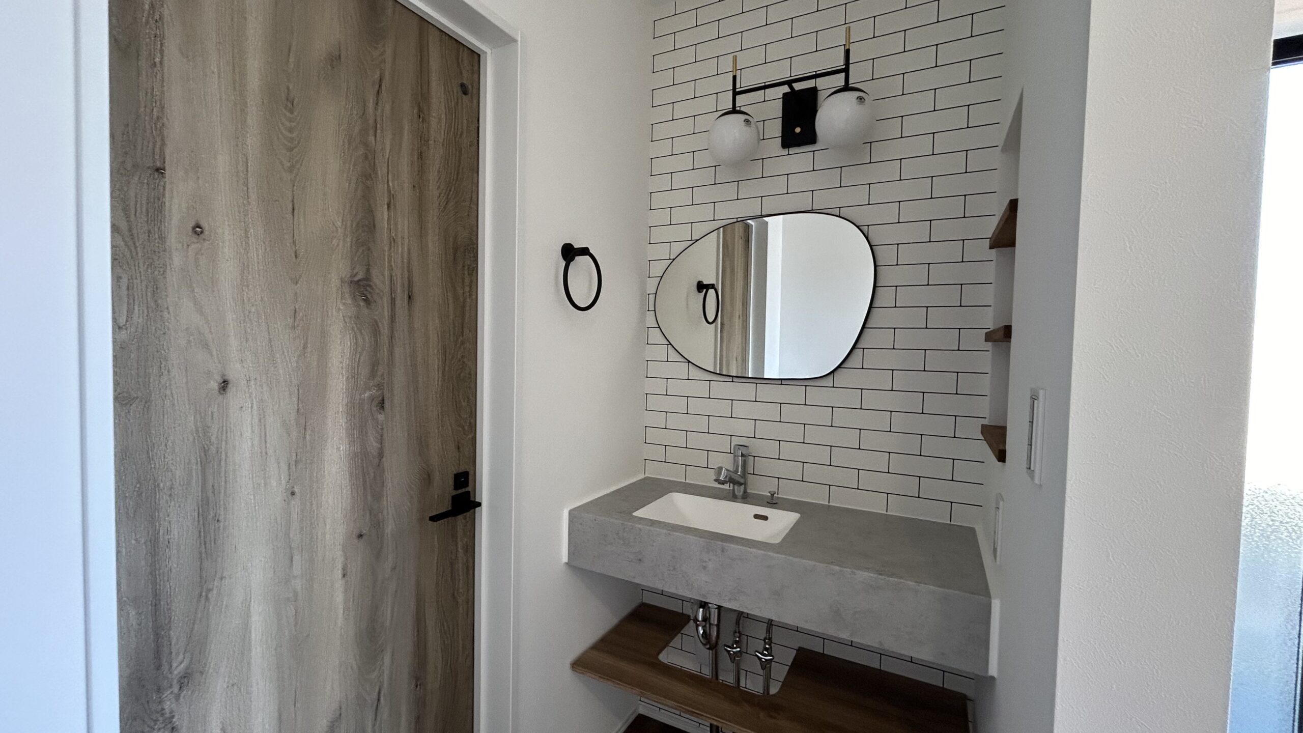 洗面化粧台の横にニッチを設置することで歯磨きブラシなど収納することができます。