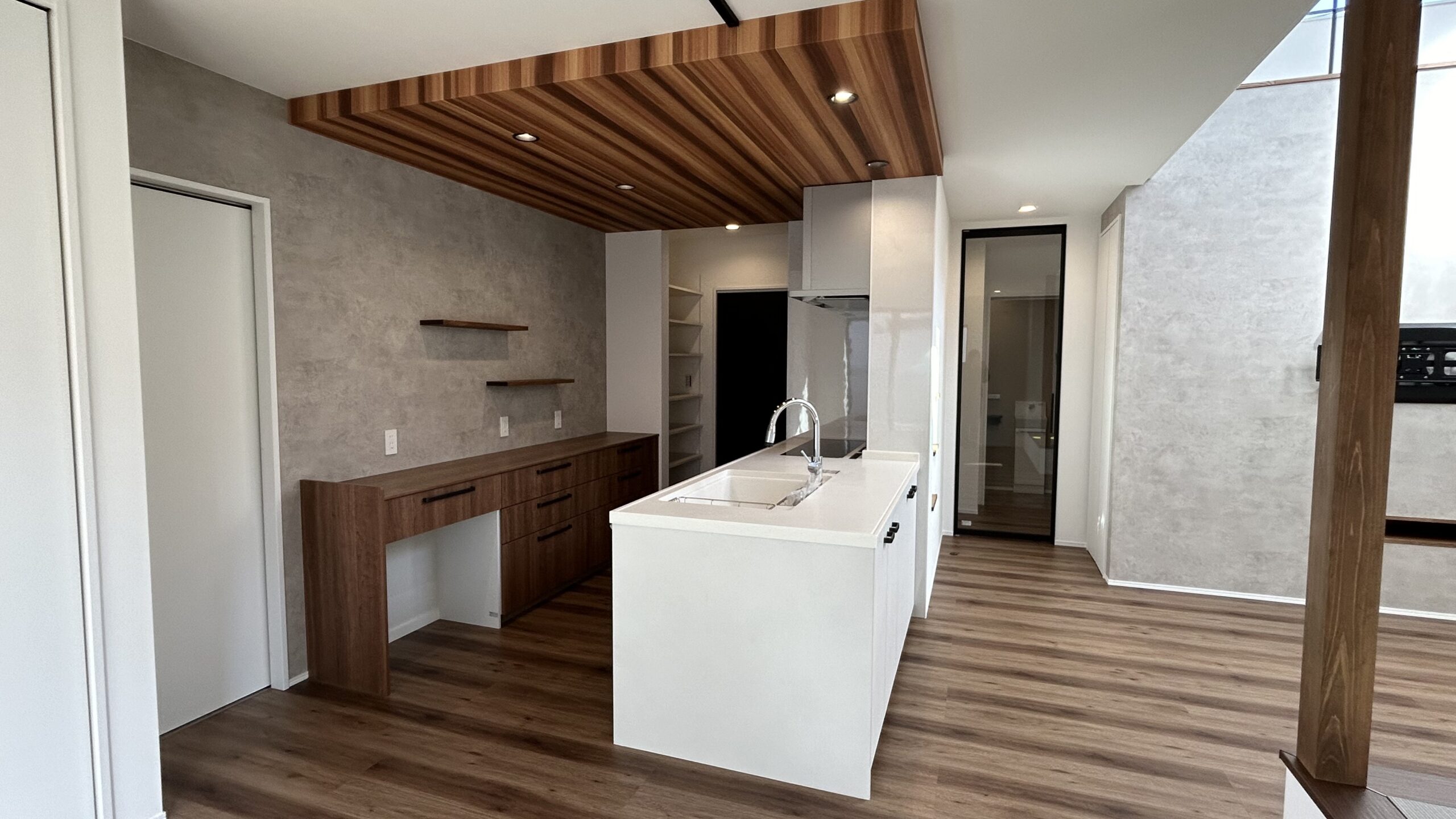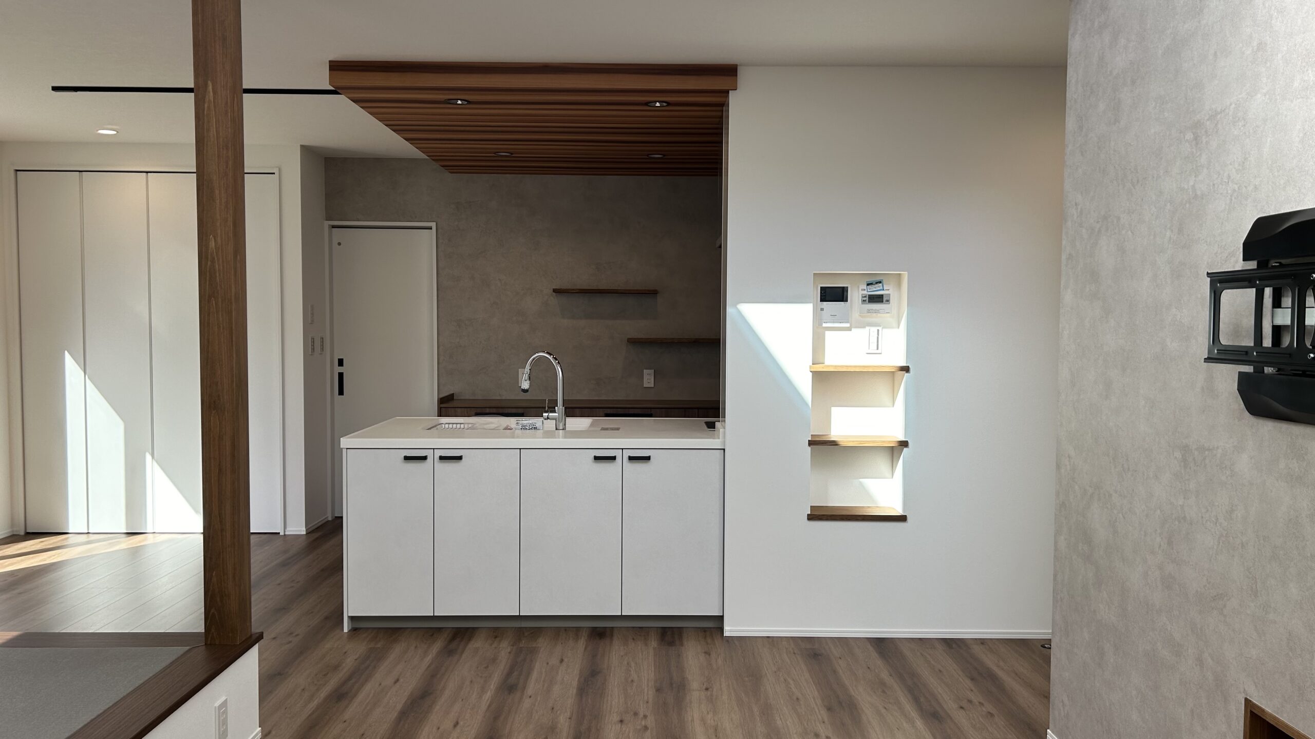 天井のクロス、カップボードの面材、床材がマッチして非常に落ち着いた空間です!