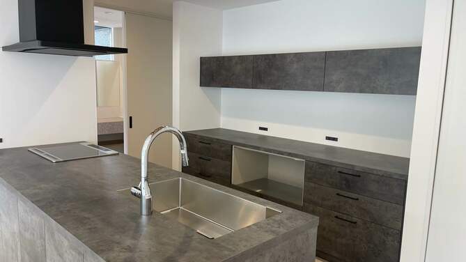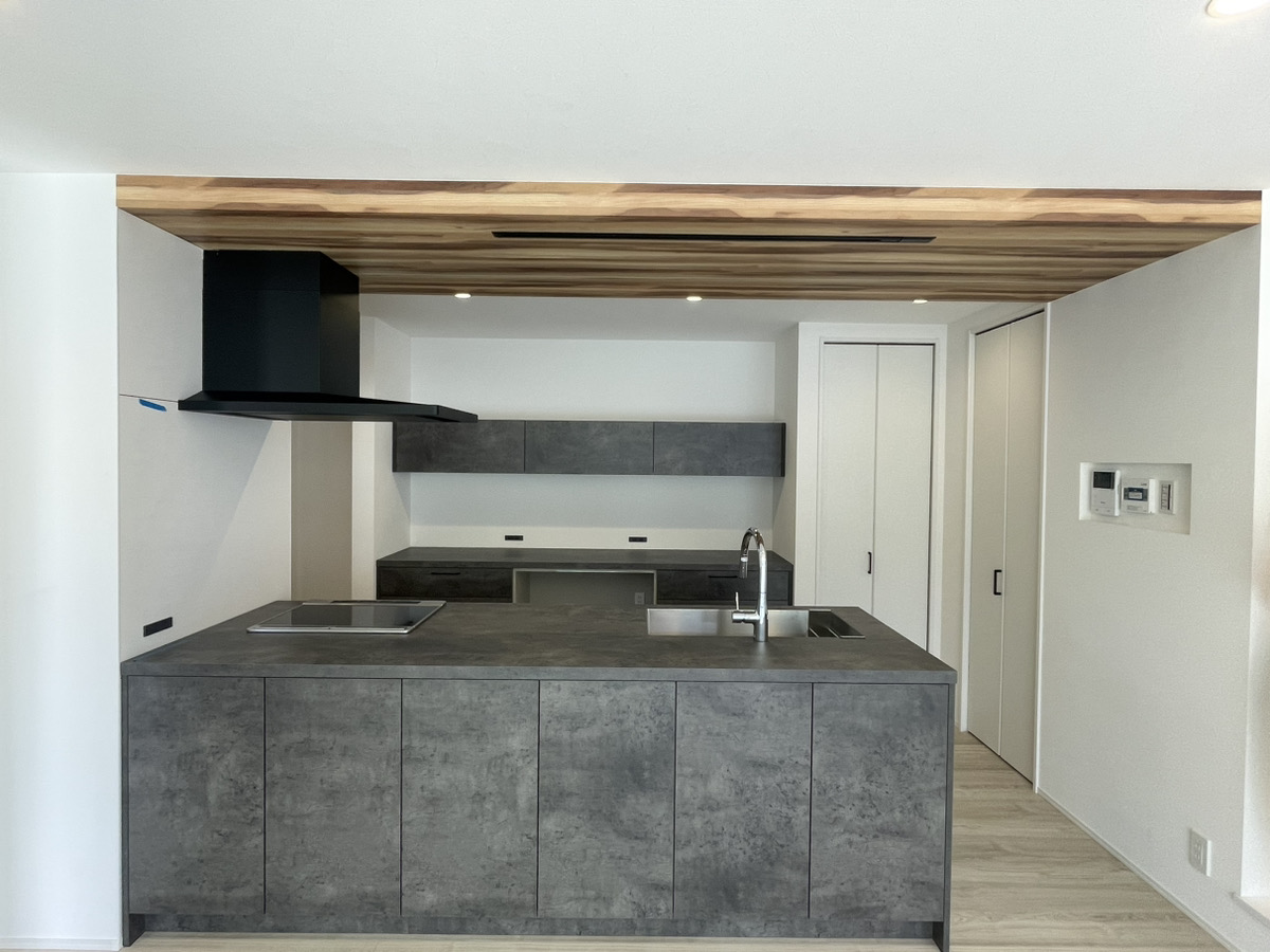 天板、扉材ともにべトングレーを採用いただき非常に高級感溢れるキッチンになります。