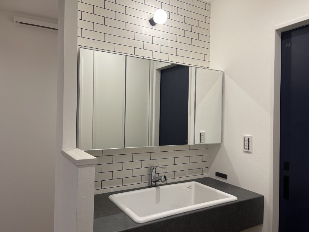 お施主様からのご要望から、ミラーの奥行ぴったりの袖壁を計算しご提案いたしました。