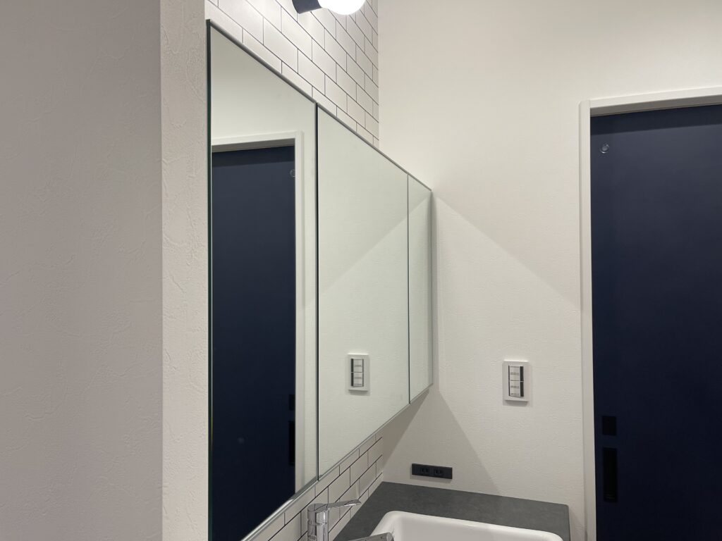 一番の工夫ポイントは、ミラーの側面を隠せるように造作した袖壁です。
