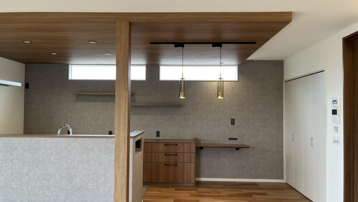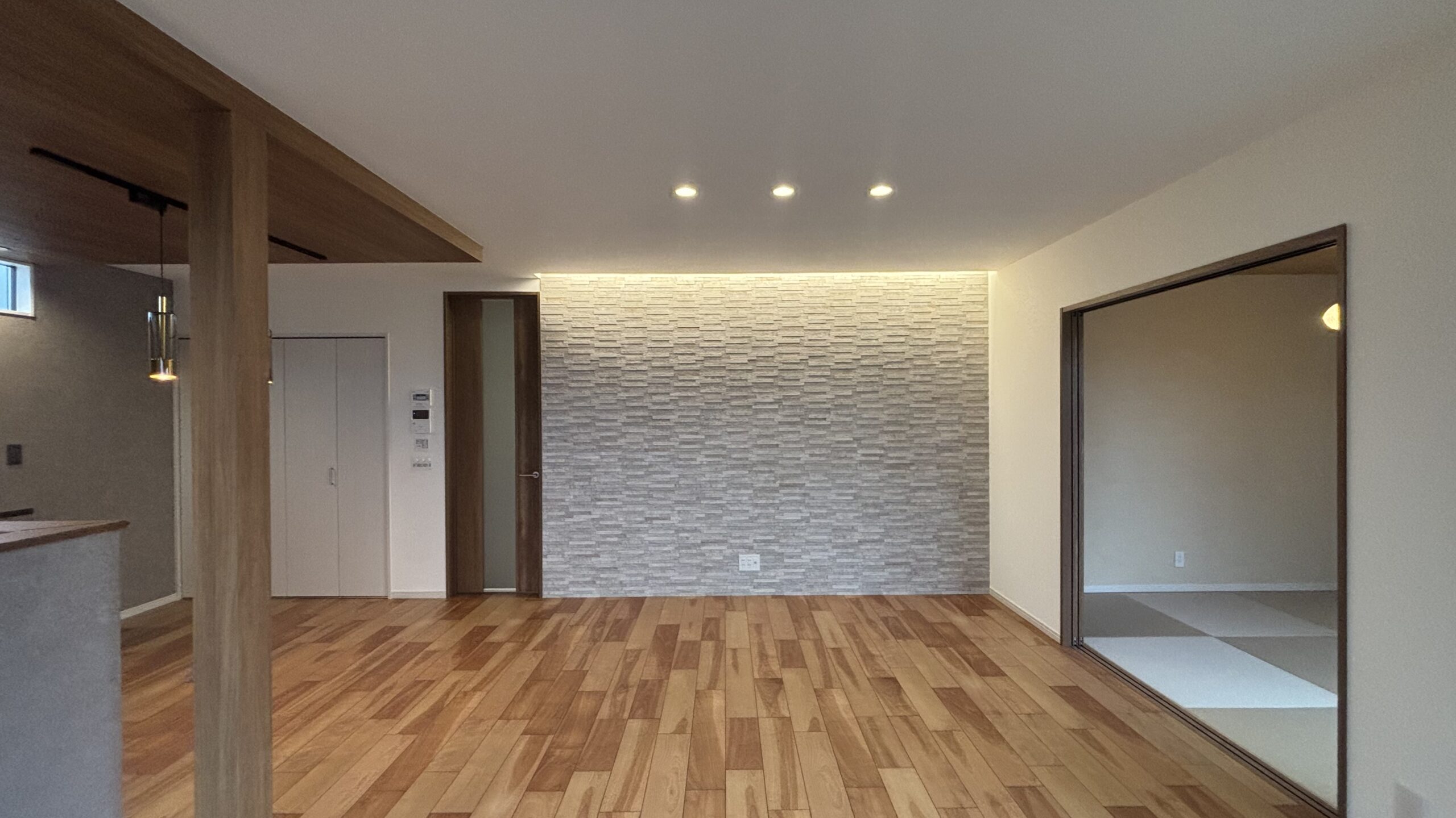 今回、テレビを設置予定の壁にエコカラット(ディニタ)を採用いただいておりまして、空間のアクセントとなっております。