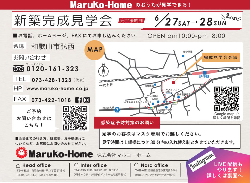 6/27(土)、28(日)に和歌山市弘西にて完成見学会を開催致します😊