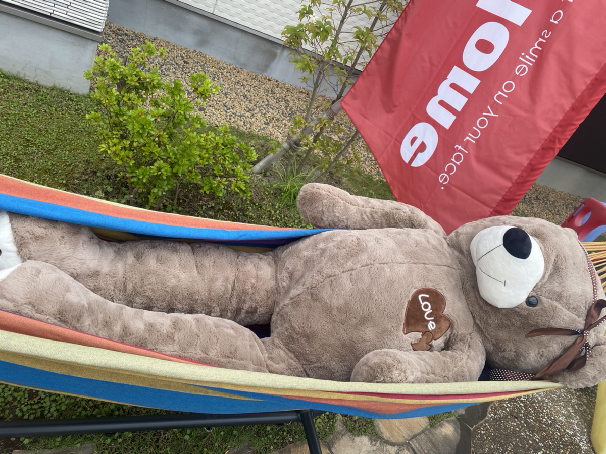 小さいお子様も、展示場の前のハンモックに揺られている〝クマミちゃん〟に