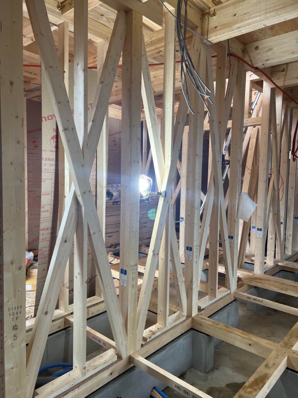 さて、外壁面にパネルを設置し、内部に柱・筋違いなどの軸組を施工した後は、