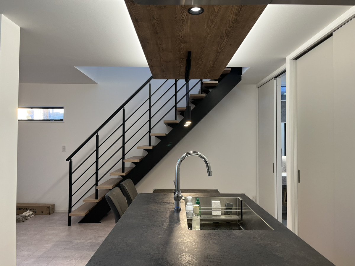 キッチンの天井を下げることで、見えない壁を作ったように空間が仕切られた印象になります。