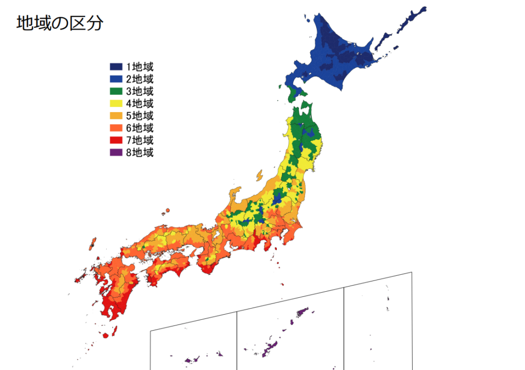 求められる断熱性能は、全国を8つの地域に区分し、地域ごとにUA値(外皮平均熱貫流率)、ηAC値(冷房期の平均日射熱取得率)が規定されています。