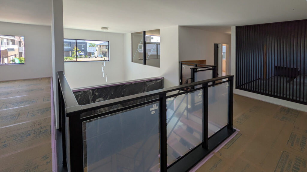 2階ホールからは、大きな吹き抜け越しにダイニングを一望👀