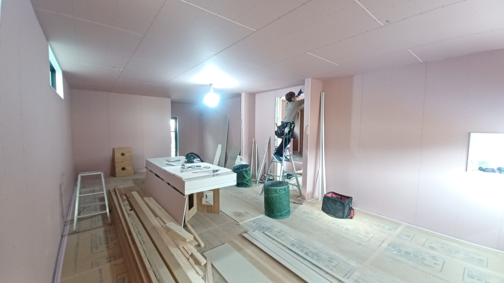壁や天井の全面に、吉野石膏さんの「ハイクリーン石膏ボード」を張っていきます。
