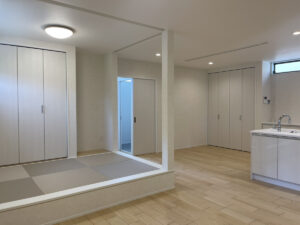 ナチュナルなタタミスペースは、床と段差がないフラットな空間、または20cm程度の小上がり空間をリビングに設けることで、開放感やリラックス効果を得られるスタイルです。