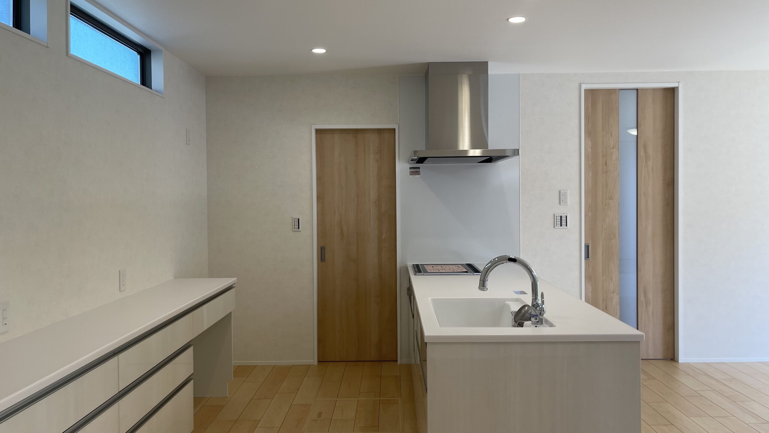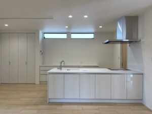 キッチンの扉やカウンター、背面のクロスなど全てを白で統一することで清々しいコーディネートになりました。