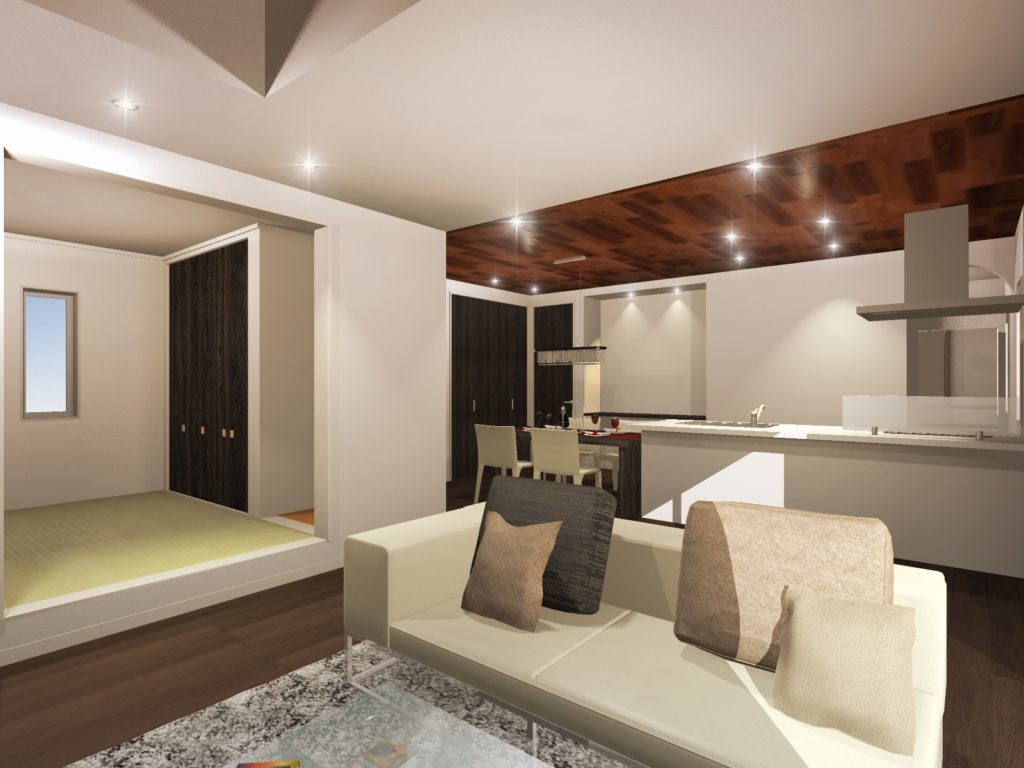 リビングと繋がっている和室は階段一段分の段差を上げ、立体感を演出しています♪