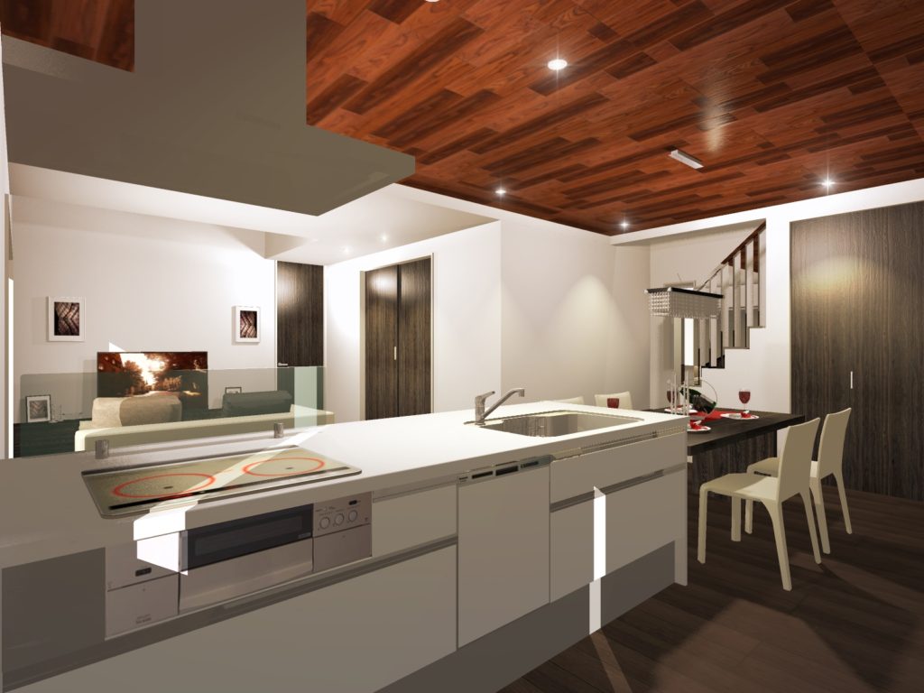 LDKは広々と見渡せるスタイルで、階段はこの空間からは見えない所に置くことで