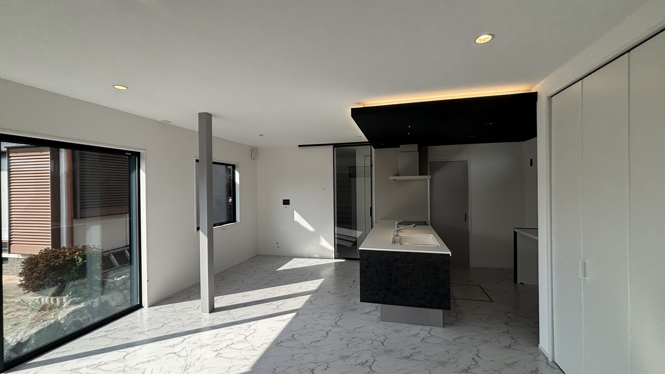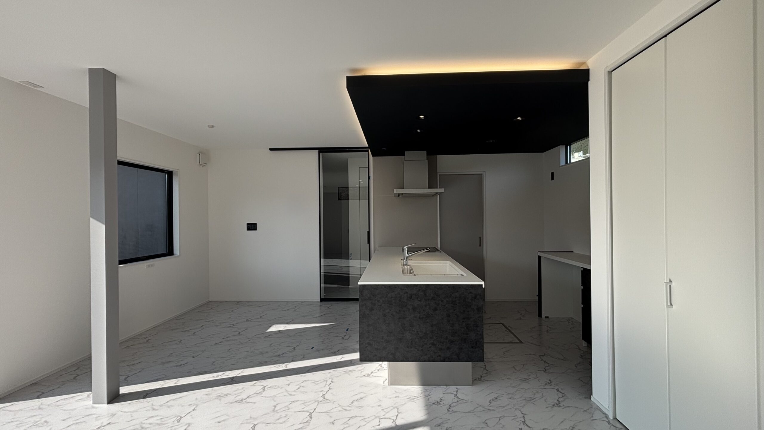白を基調としたLDKに映える黒のキッチン♪