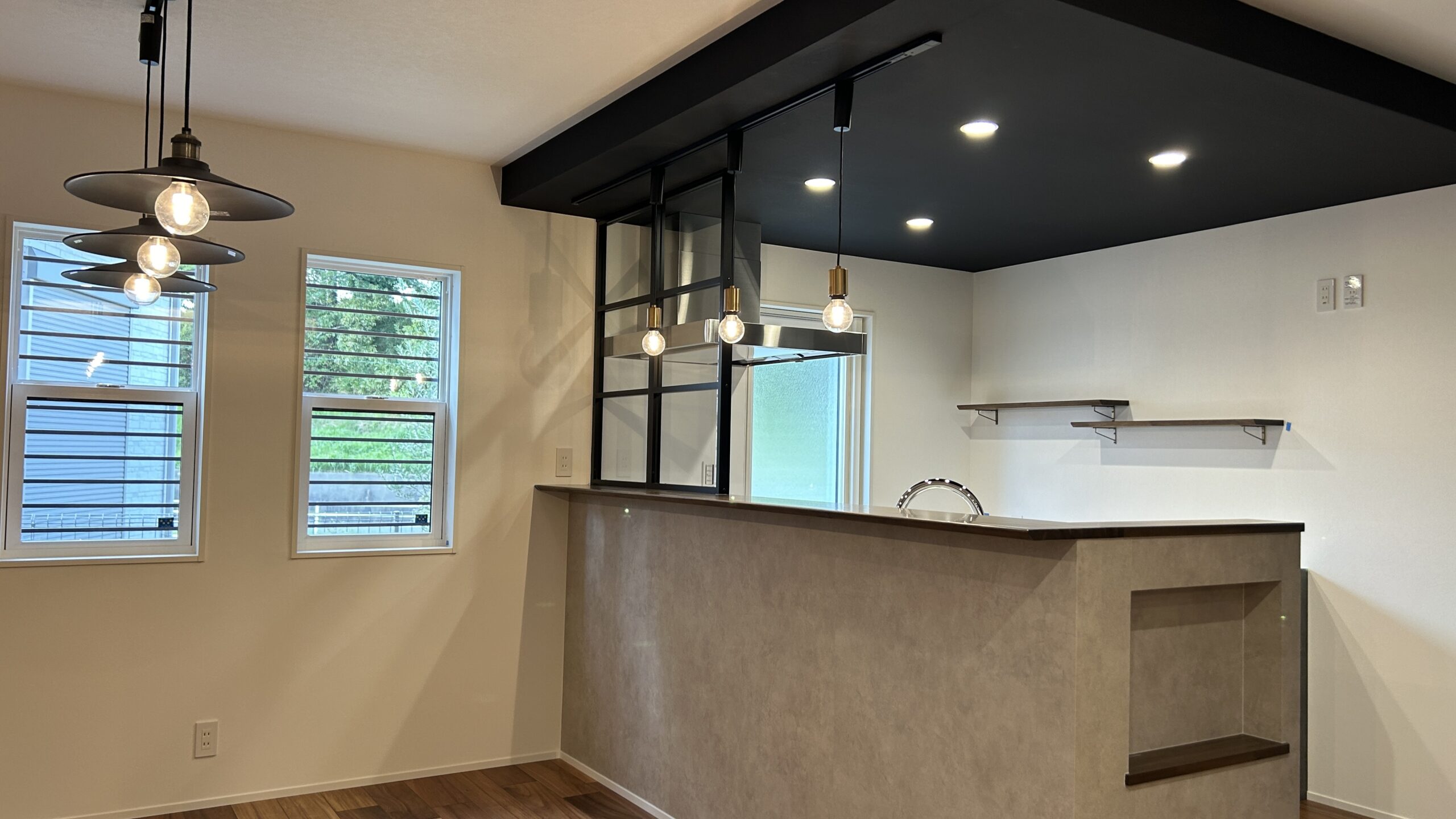 まずはキッチンですが、黒のクロスを施工した下がり天井と、グレーの腰壁に