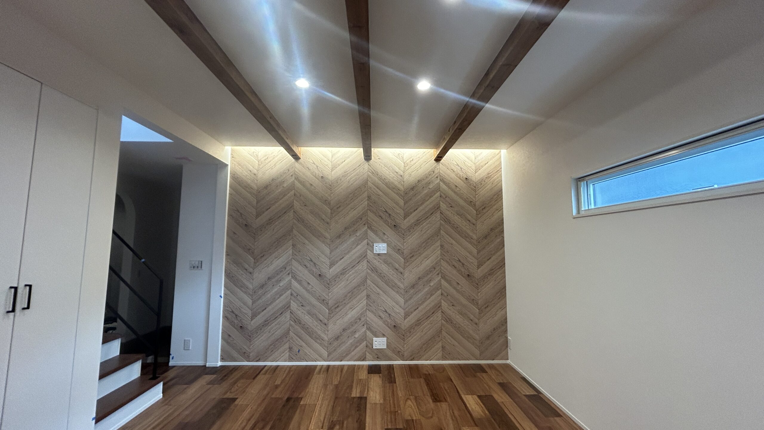 続いて、リビングは梁見せを行うために天井を高くし、テレビ側の壁にはヘリンボーンの