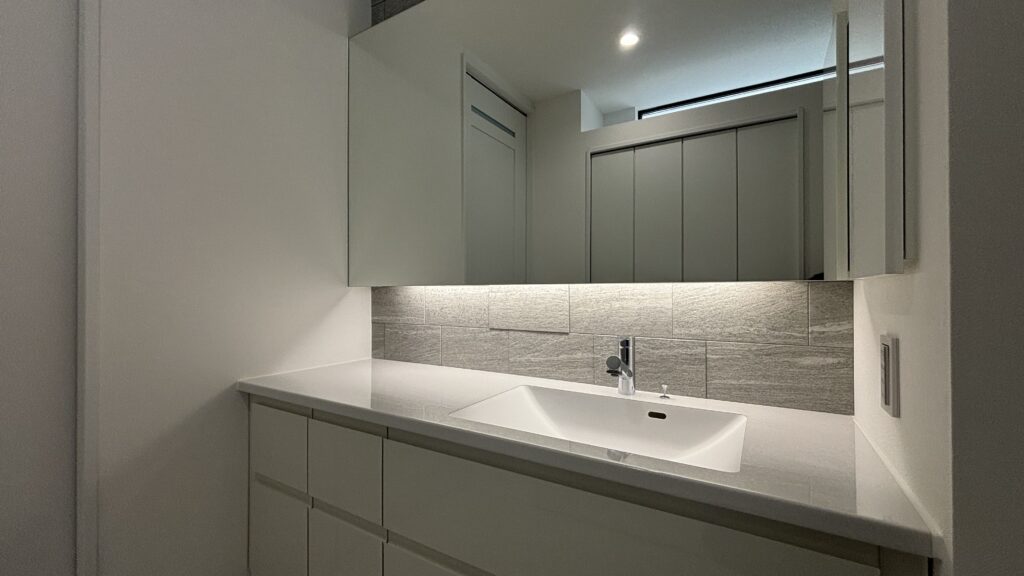 また、正面にはエコカラットに間接照明を入れており、高級ホテルのような洗面となっています!