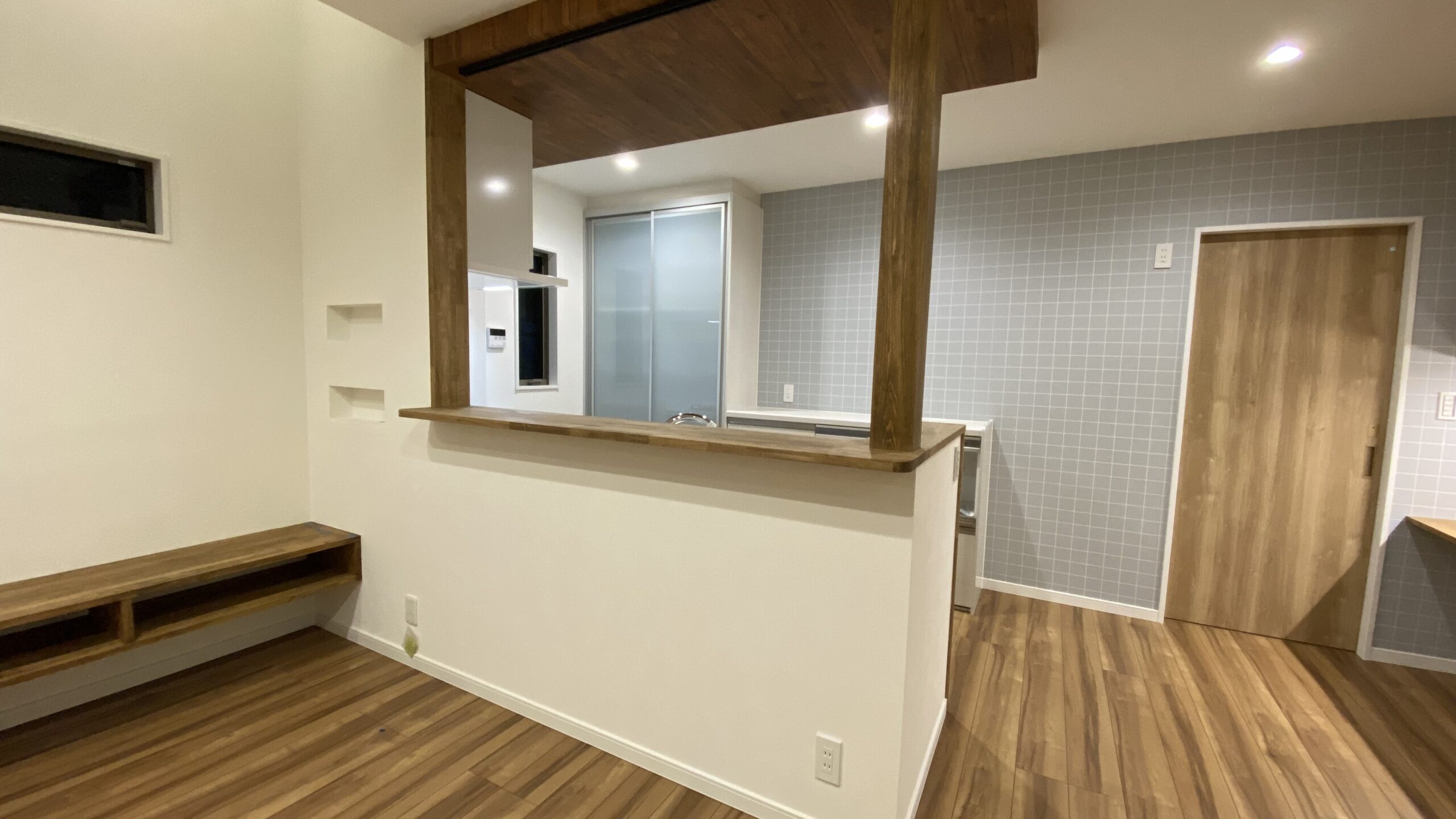 キッチン上部は下がり天井にし、木目柄のクロスを施工