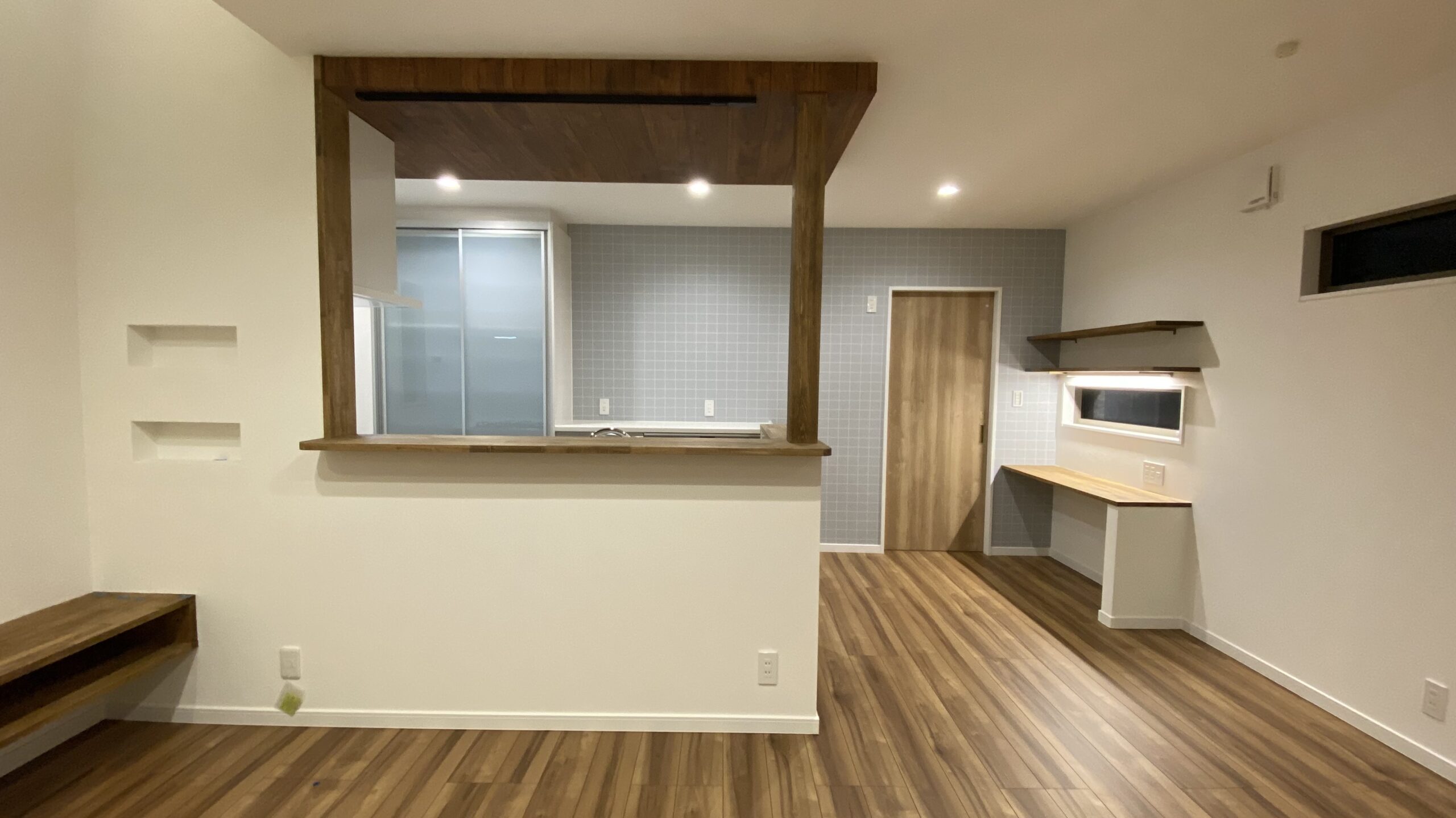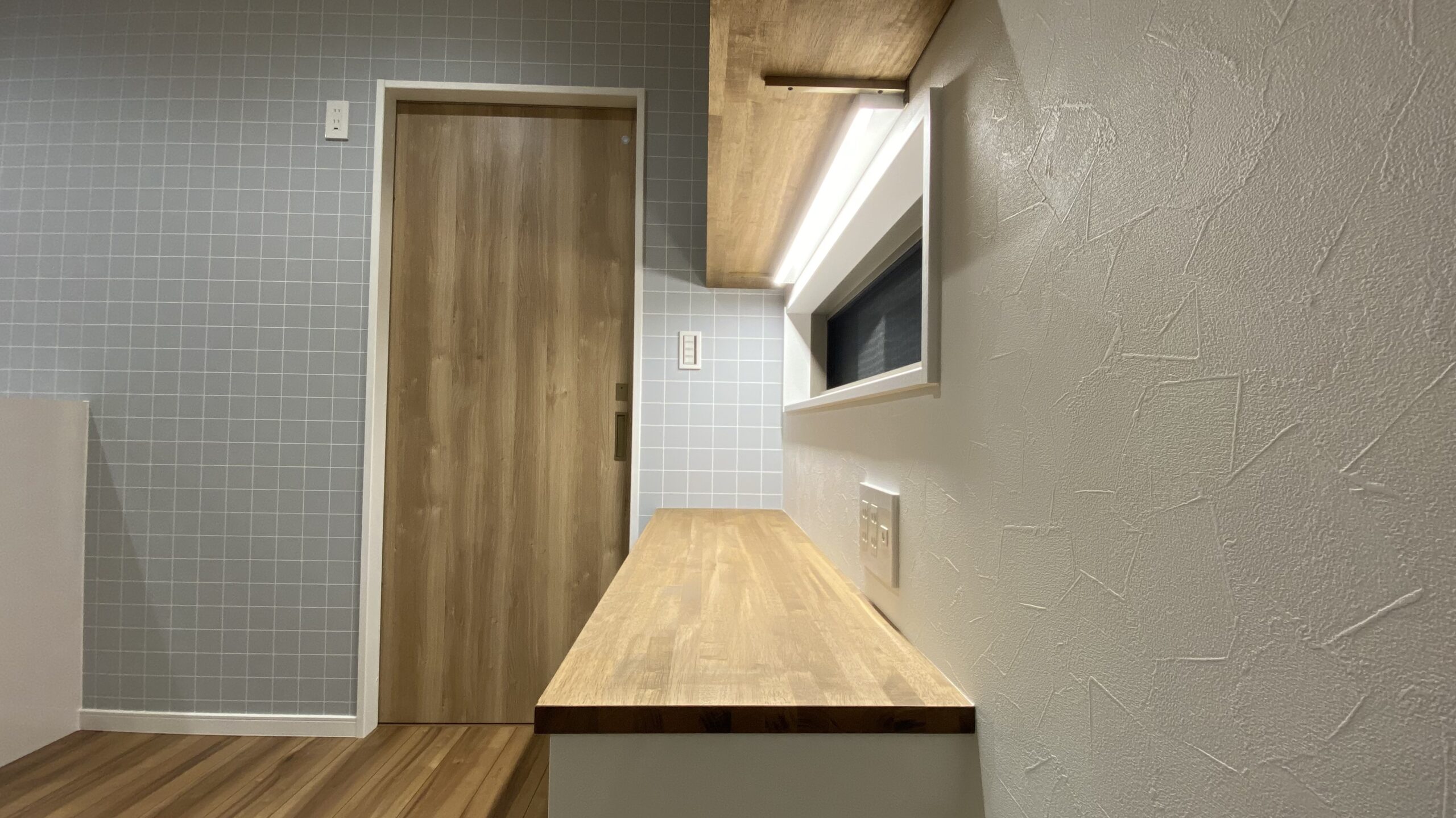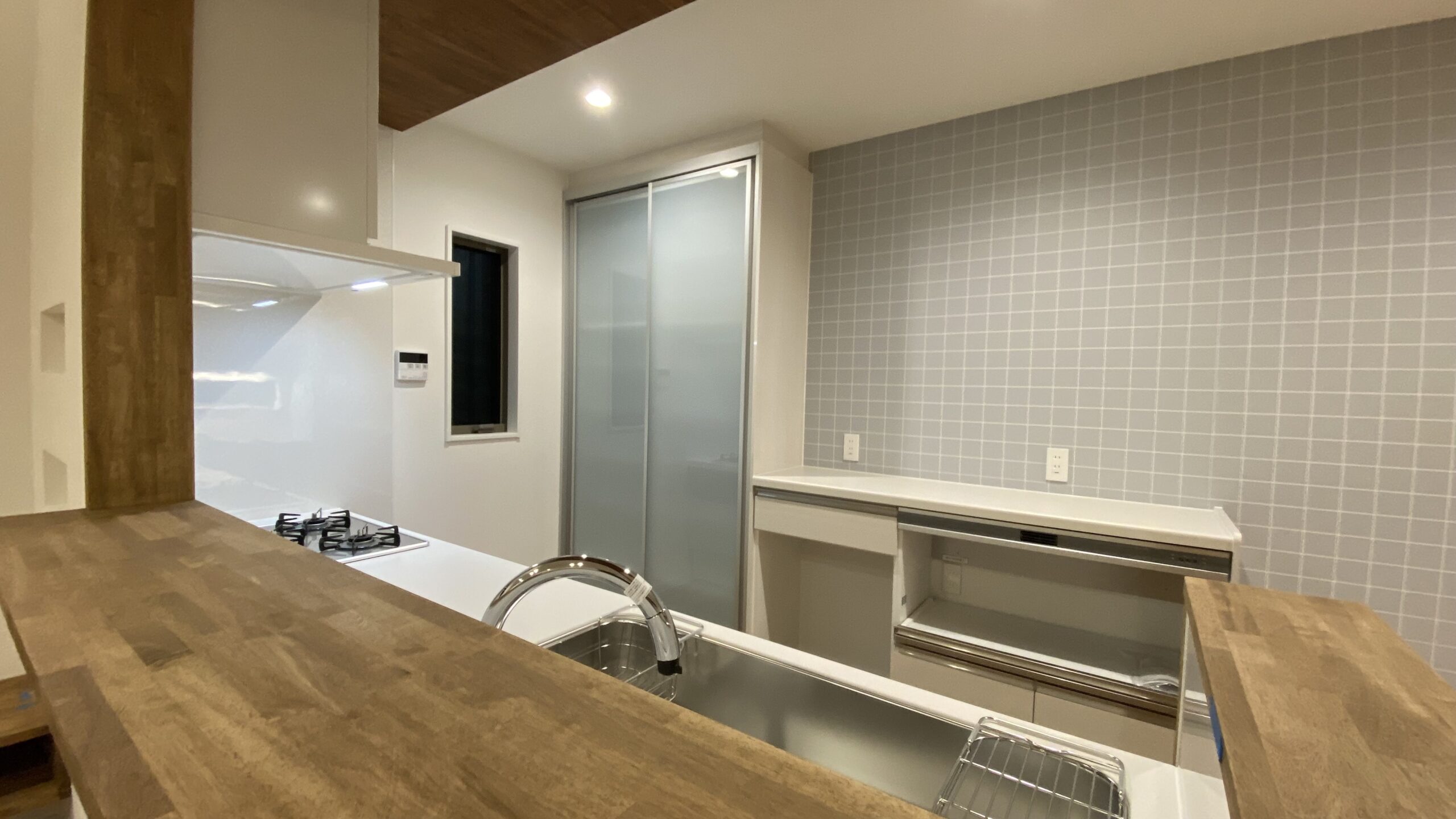 その奥にあるカップボード背面にはタイル柄のクロスを施工していますキッチン横にはカウンターを設けております。