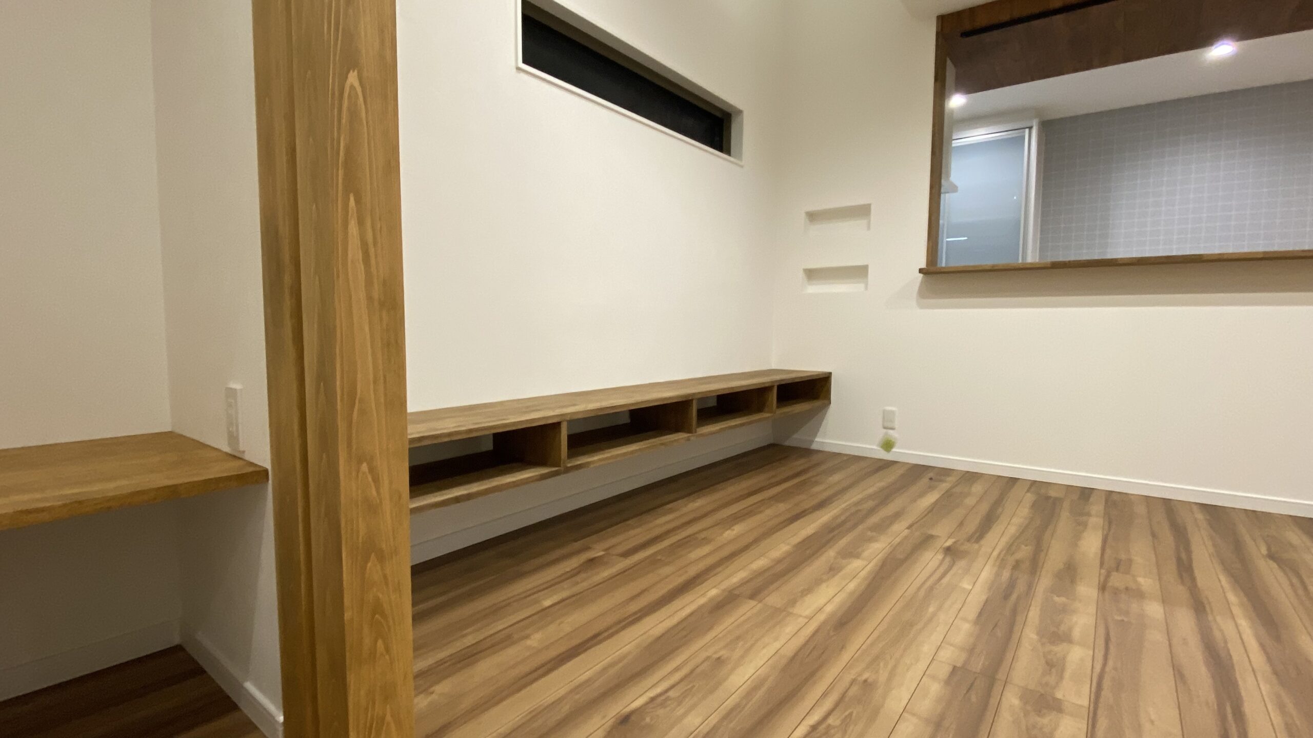 カウンターや棚板は全て集成材を使用し、床色やキッチン上部の天井クロスの色味と揃える事で、纏りのあるインテリアになりました!